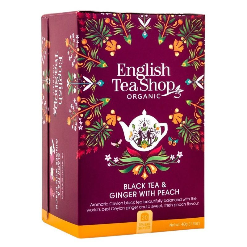 English Tea Shop gyömbéres-őszibarackos édes és fűszeres fekete tea gyömbérrel fűszerezve, valódi organikus barack darabokkal. Garantáltan kellemessé teszi napodat különleges ízével. Az English Tea Shop a legfinomabb ízeket és újdonságokat hozza, egyenesen Angliából. Összetevők: fekete tea, gyömbér, őszibarack darabok, természetes őszibarack ízesítéssel. Ellenőrzött ökológia gazdálkodásból.