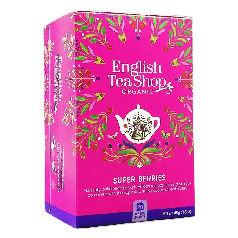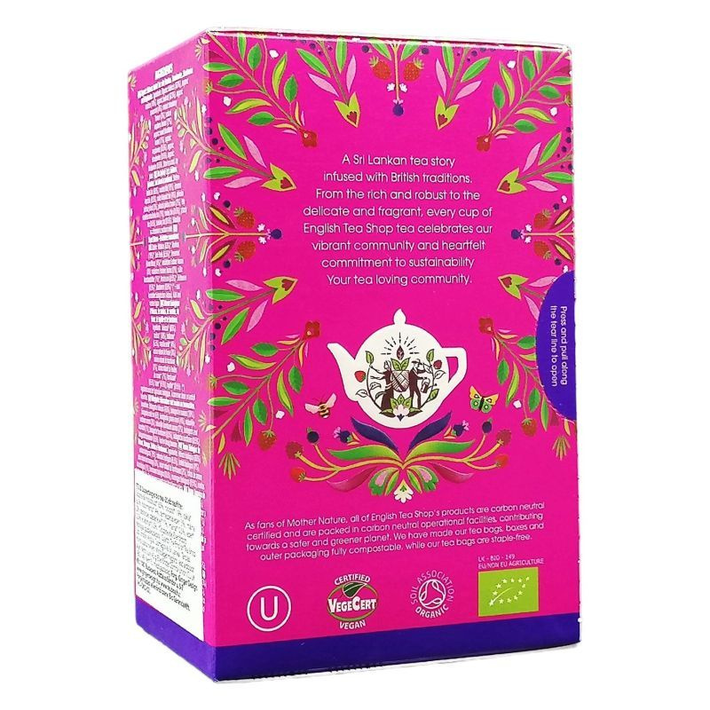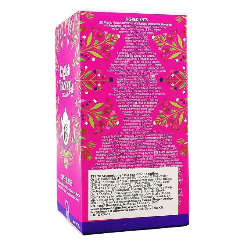 Összetevők: hibiszkusz,* rooibos,* fodormenta,* málna,* eper,* kékáfonya,* természetes málna és eper ízesítéssel. *Összetevők: Ellenőrzött ökológiai gazdálkodásból. Gyártó: The English Tea Shop Ltd. London. Nagy-Britannia. Csomagolva: Sri Lanka. Tárolás: Hűvös száraz helyen. Minőségét megőrzi: lásd a doboz alján.