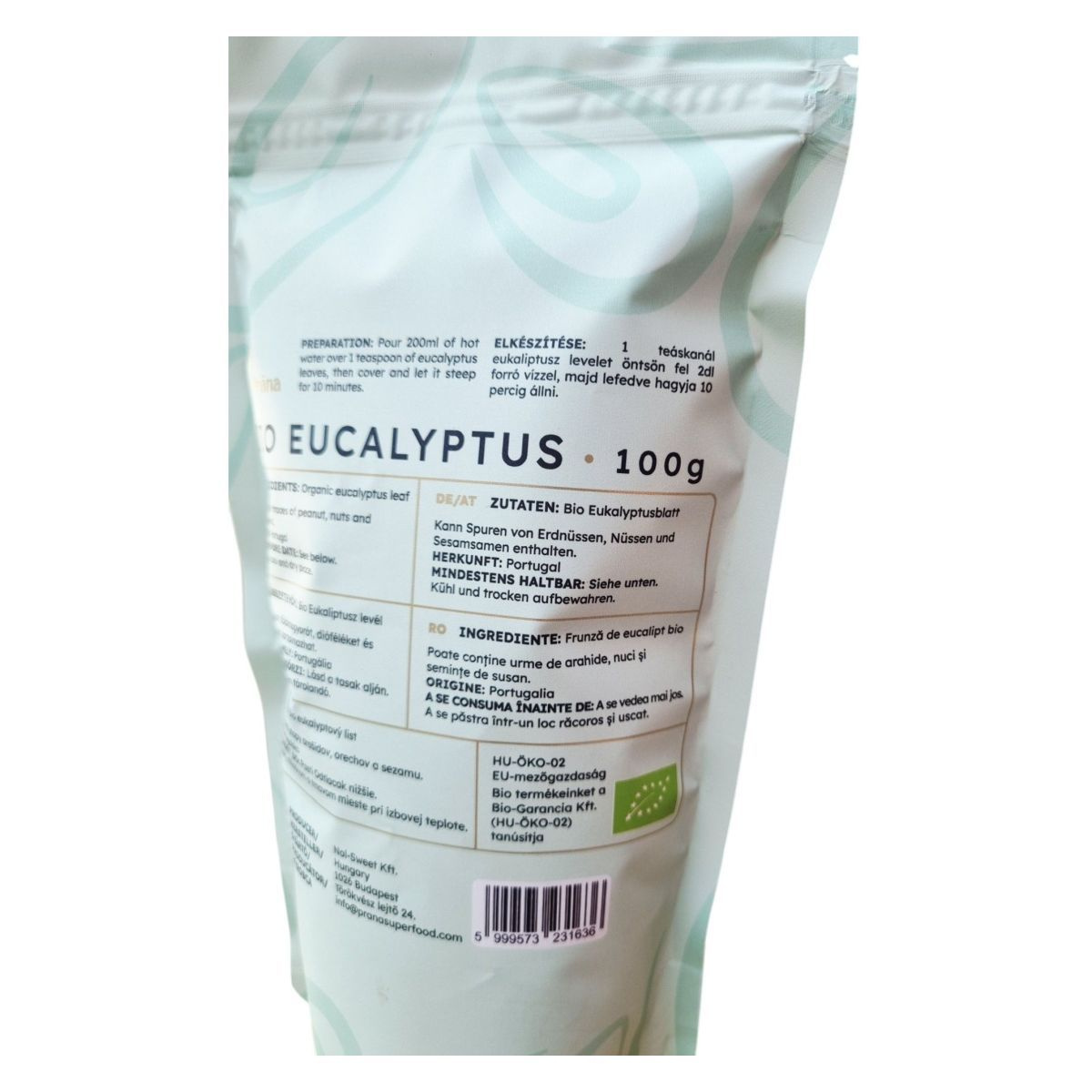 A Prána BIO EUCALYPTUS tea Portugáliából származó, organikus eukaliptusz levelekből készül. A termék 100% természetes, gluténmentes, bio és vegán, így széles körben fogyasztható. A tea elkészítése egyszerű: 1 teáskanál levelet 200 ml forró vízzel kell leönteni, majd 10 percig lefedve állni hagyni. A termék nyomokban tartalmazhat földimogyorót, dióféléket és szezámmagot, ezért allergiások számára fontos lehet az összetevők ellenőrzése. A tea frissítő és nyugtató hatású lehet, ideális választás lehet pihenéshez és feltöltődéshez.