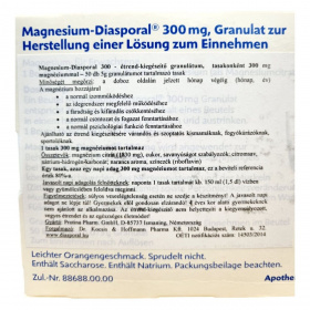 A Magnesium Diasporal 300 mg egy étrend-kiegészítő granulátum, amelyet a normál izomműködés, az idegrendszer megfelelő működése, valamint a fáradtság és kifáradás csökkentése érdekében fejlesztettek ki. A termék 50 db 5g granulátumot tartalmazó tasakot tartalmaz, melyek mindegyike 300 mg magnéziumot biztosít. A magnézium citrát formájában van jelen, és a napi beviteli referencia érték 80%-át fedezi. A termék narancs ízesítésű, nem pezseg, és szacharózt, valamint nátriumot tartalmaz. Ajánlható várandós és szoptatós kismamáknak, fogyókúrázóknak és sportolóknak is.