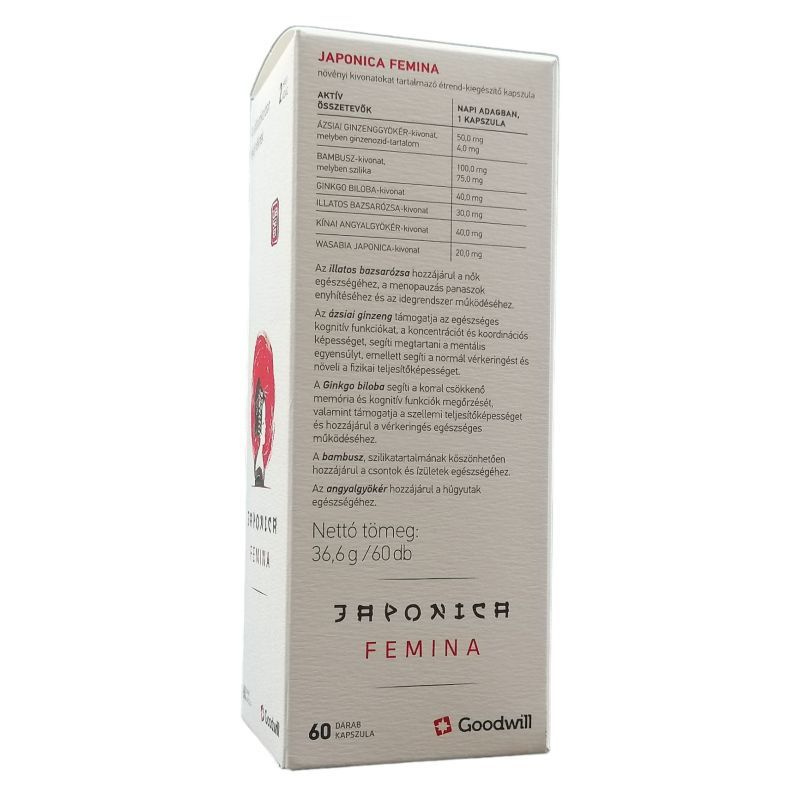 Japonica Femina: hormonmentes, naponta 1 kapszula. 1 doboz 2 havi adagot biztosít.