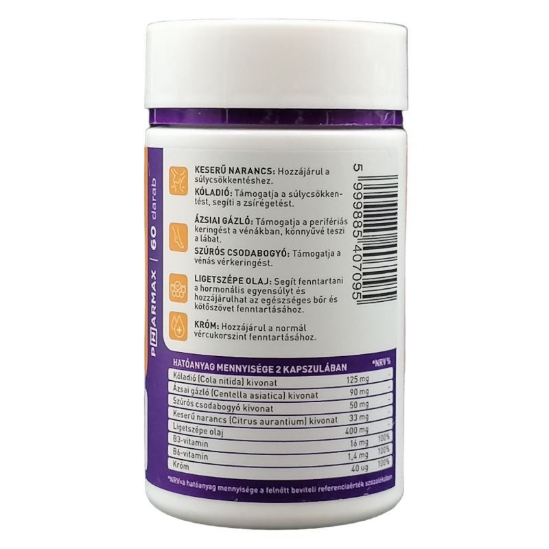 Hatóanyag mennyisége 2 kapszulában (napi adag): kóladió 104 mg (ebből koffein 12,5 mg), ázsiai gázló 90 mg, szúrós csodabogyó kivonat 50 mg, keserű narancs 33 mg (ebből szinefrin 10 mg), ligetszépeolaj 400 mg, B3-vitamin 16 mg, B6-vitamin 1,4 mg, króm 40 ug