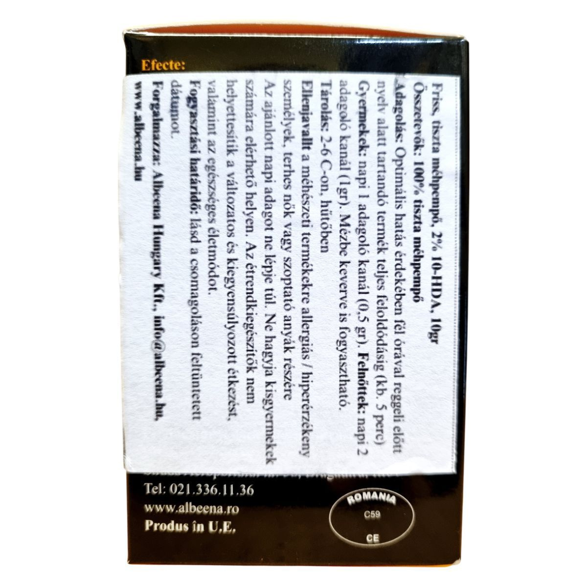 Az ALBEENA Lăptișor de matcă pur egy prémium minőségű étrend-kiegészítő, amely tiszta méhpempőt tartalmaz. A termék élő táplálékként van megjelölve, és hűtőszekrényben tárolandó. A használati útmutató szerint a legjobb eredmény érdekében reggel, sublingualisan kell alkalmazni, étkezés előtt 30 perccel. A termék gyermekek és felnőttek számára is ajánlott, de nem javasolt terhes nőknek, szoptató anyáknak, valamint azoknak, akik allergiásak a méhészeti termékekre. További részletek a belső tájékoztatóban találhatók.