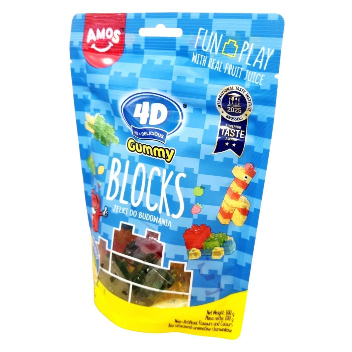 Amos 4D Blocks: vegyes gyümölcsízű (alma, áfonya, citrom, eper) építhető gumicukorka. A csomagolás szórakoztató dizájnnal, „fun play with real fruit juice” szlogennel hirdeti a játékos fogyasztási élményt. Nem tartalmaz mesterséges aromákat és színezékeket. Származási ország: Kína.
