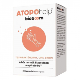 Atopohelp Bioboom, béta-glükán és zöldtea-kivonat tartalmú kapszula tejsavbaktériumokkal, cinkkel és biotinnal a bőr normál állapotának megőrzésére.