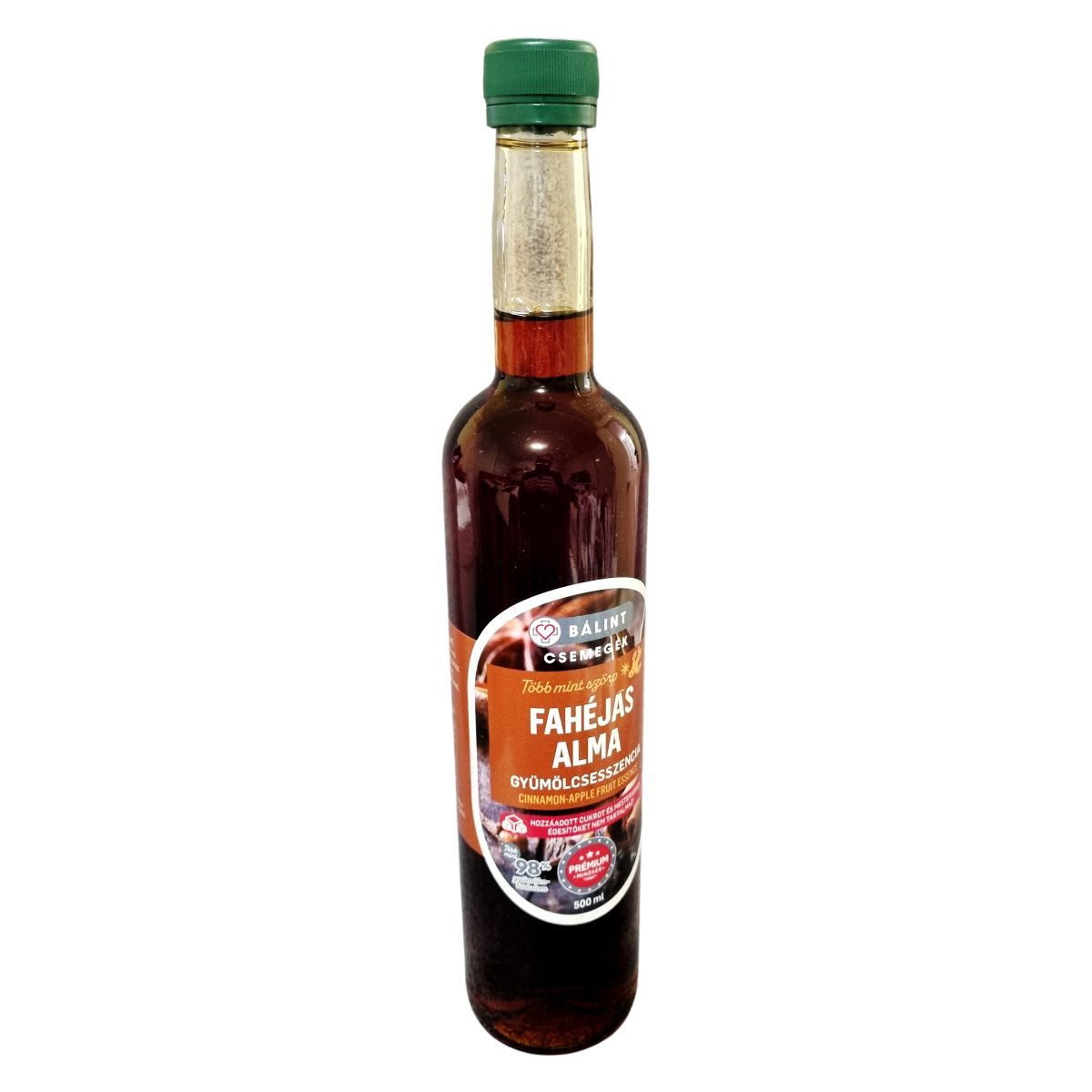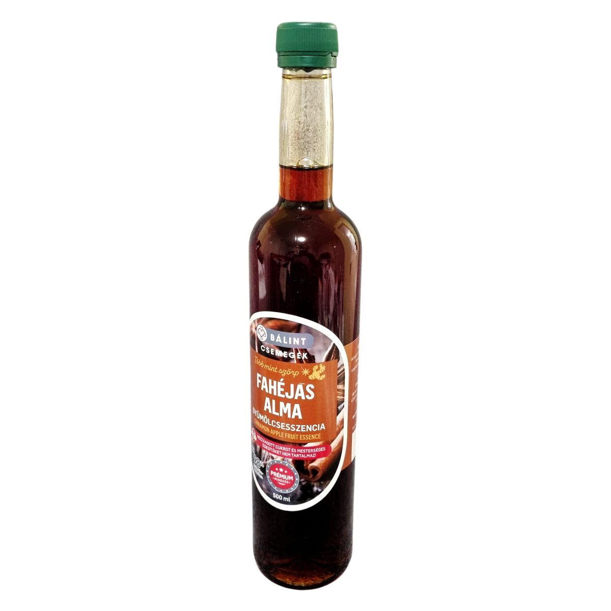 A fahéjas alma gyümölcsesszencia almából készült, fahéj, gyömbér és szegfűszeg kivonattal ízesítve. Meleg italokhoz és desszertekhez ajánlott, cseppmentes kiöntővel és környezetbarát csomagolásban kerül forgalomba. A termék kizárólag az alapanyagok természetes nátriumtartalma miatt tartalmaz sót.