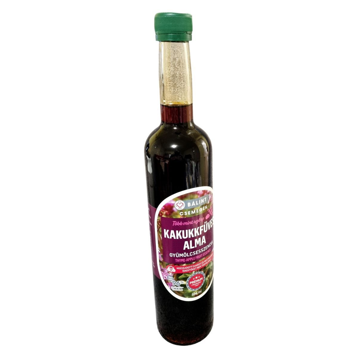 A kakukkfüves alma gyümölcsesszencia feketeribizlivel gazdagított, prémium minőségű termék. Cseppmentes kiöntővel ellátott, környezetbarát csomagolásban kerül forgalomba, és kizárólag az alapanyagok természetes nátriumtartalmából adódóan tartalmaz sót.