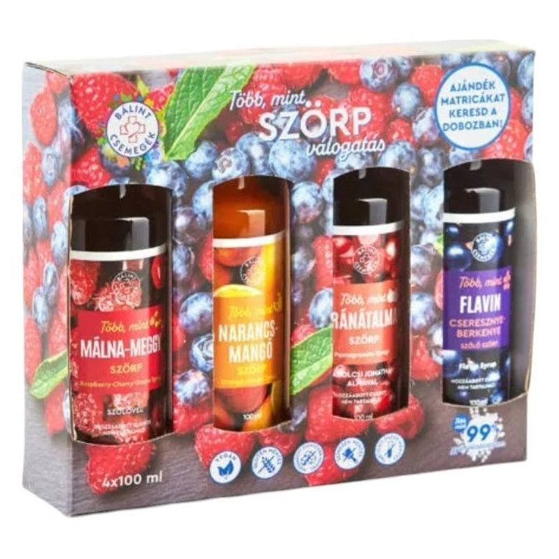 Több mint szörpök, több mint 99% gyümölcstartalommal válogatás. 4x100ml: málna-meggy, narancs-mangó, gránátalma, flavin.