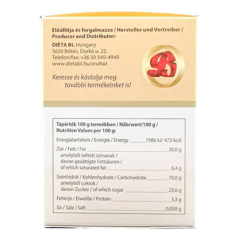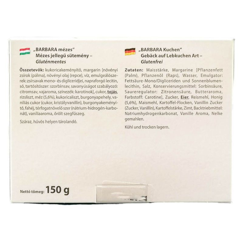 Összetevők: kukoricakeményítő, margarin (növényi olajok és zsírok (pálma, repce, szója, napraforgó) víz, só, emulgeálószerek: zsírsavak mono és digliceridjei, tartósítószer: kálium-szorbát, savanyúságot szabályozó: citromsav, színezék: karotinok, aroma), cukor, tojás, rizsliszt, méz (5, 6%), kukoricaliszt, burgonyapehely (burgonyapor, emulgeálószer: zsírsavak mono és digliceridjei, , stabilizátor: dinátrium-difoszfát, , tartósítószerek: nátrium-szulfit és nátrium-hidrogén-szulfit, étkezési sav: citromsav), vaníliás cukor (cukor, aroma: kristályvanillin), burgonyakeményítő, fahéj, térfogatnövelőszer: nátrium-hidrogén-karbonát, vaníliaaroma, őrölt szegfűszeg.