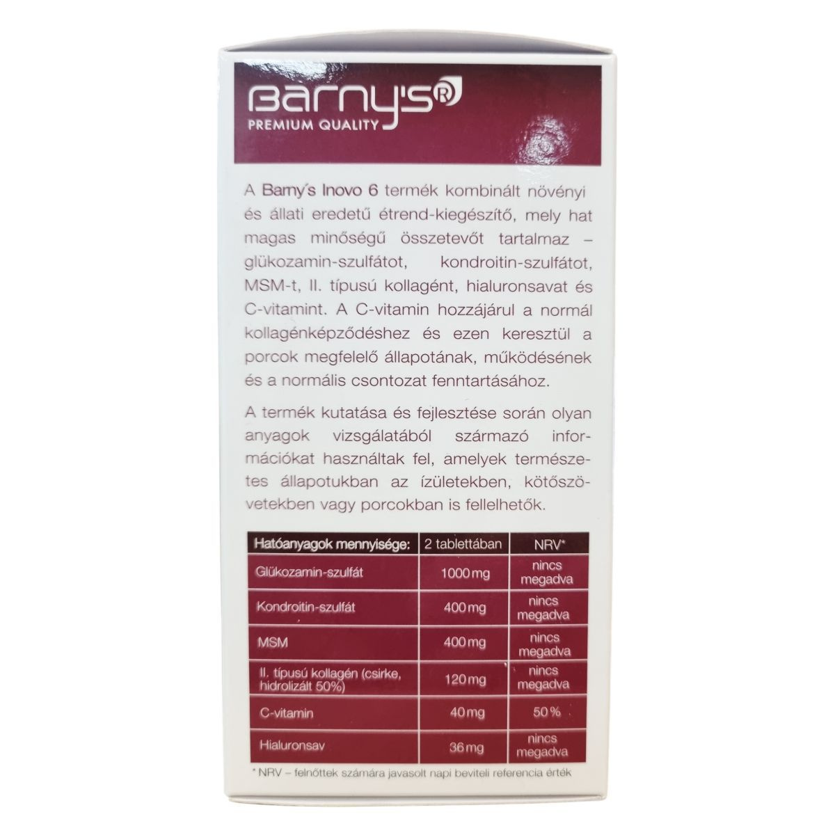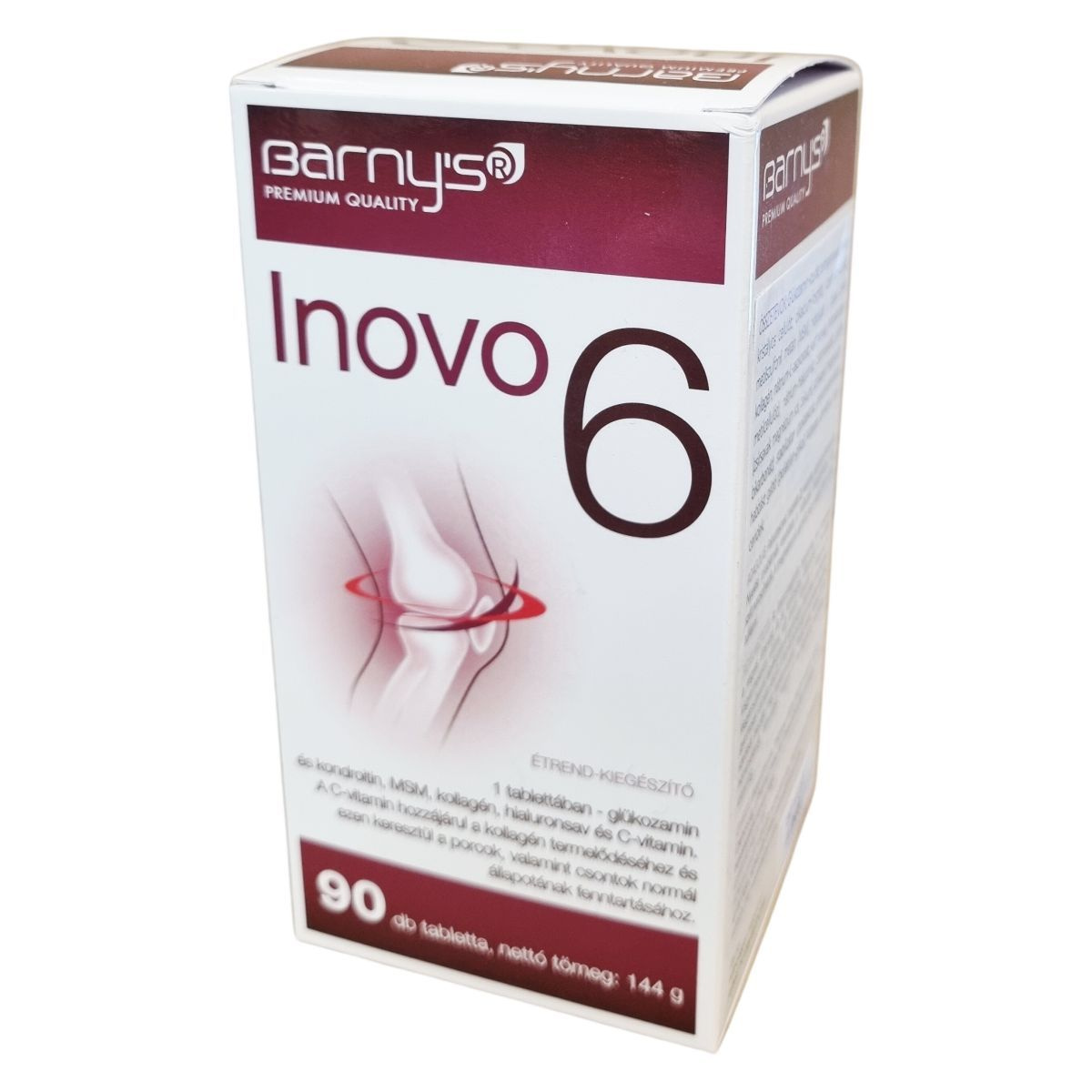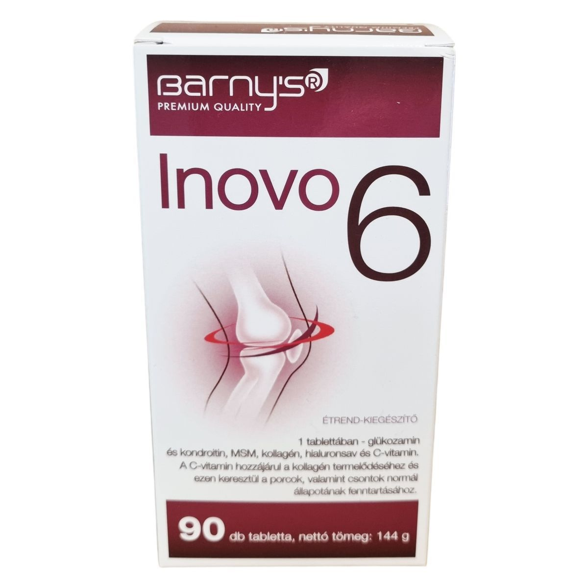 A barny's® Inovo 6 kombinált növényi és állati eredetű étrend-kiegészítő, amely glükozamin-szulfátot, kondroitin-szulfátot, MSM-t, II. típusú kollagént, hialuronsavat és C-vitamint tartalmaz. A C-vitamin hozzájárulhat a kollagén termelődéséhez, ami támogatja a porcok és csontok normál állapotának fenntartását. A termék összetevői természetes módon megtalálhatók az ízületekben, kötőszövetekben és porcokban. A termék gyártása az Európai Unió területén történik, és a biopol GN s.r.o. gyártja, míg a forgalmazást a VOGUSZ HUNGARY Kft. látja el. A tabletták adagolása egyszerű, a tabletták szükség esetén könnyen félbe törhetők vagy szétmorzsolhatók a nyelési problémák megkönnyítésére. A termék használata mellett ajánlott a változatos és kiegyensúlyozott étrend és egészséges életmód fenntartása.