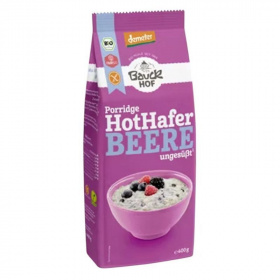 A Bauckhof bio meleg zabkása bogyós gyümölcsökkel egy tápanyagban gazdag, gyorsan elkészíthető reggeli, amely ötvözi a biodinamikusan termesztett, teljes kiőrlésű gluténmentes zabpelyhet és a frissítő, természetes bogyós gyümölcsöket. A 19%-os gyümölcstartalom – ribizli, szeder, áfonya, eper és málna – gondoskodik az intenzív, természetes ízélményről és a kiegyensúlyozott tápanyagbevitelről.Ez a zabkása nem tartalmaz hozzáadott cukrot, csak a gyümölcsök természetes édességére épít, így egészséges és tudatos választás a nap indításához. Kiváló forrása az értékes rostoknak, lassan felszívódó szénhidrátokat biztosít, és hosszan tartó teltségérzetet nyújt.