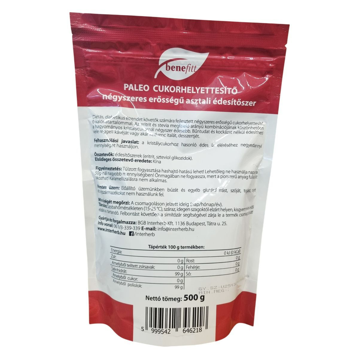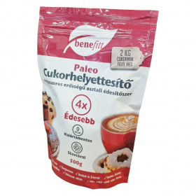 A benefitt Paleo Cukorhelyettesítő diétás és diabetikus étrendet követők számára készült, négyszeres édesítőerejű asztali édesítőszer, amely eritrit és stevia megfelelő arányú kombinációján alapul. A hagyományos kristálycukornál négyszer édesebb, így megkönnyíti az édesítés élvezetét bűntudat és kockázat nélkül. Kalóriamentes termék, amely ideális reggeli kávé, italok vagy desszertek ízesítésére. Gyártása során figyelnek az allergénekre, mentes gluténtől, szójától, tojástól, tejtől és tejszármazékoktól. Fontos azonban a fogyasztás mennyiségének betartása és a használati útmutató követése a legjobb eredmény és biztonság érdekében.