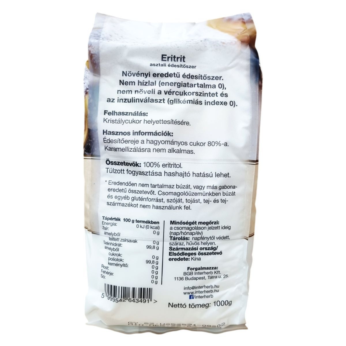 Az eritrit egy természetes, növényi alapú édesítőszer, mely nem alkalmas karamellizálásra. Az eredendően gluténmentes termék csomagolóüzemében nem használnak fel gluténforrásokat, szóját, tojást, valamint tej- és tejszármazékokat. A termék származási országa Kína.