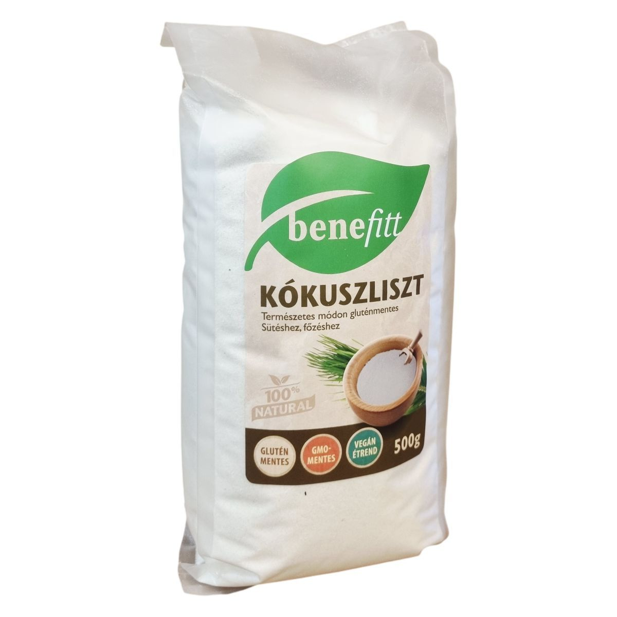 A benefitt kókuszliszt kizárólag kókuszdió szárított, zsírtalanított húsából készül, ezért gluténmentes és hipoallergén. Alacsony glikémiás indexű (45), így alkalmas különféle étrendi igényekre. Előállítása természetes, és nem tartalmaz glutént, koleszterint, szóját, tojást, valamint tej- és tejszármazékokat. Üzemükben nem használják fel az említett allergéneket és gluténforrásokat. A nettó tömege 500 gramm, és az Európai Unió területéről származik.