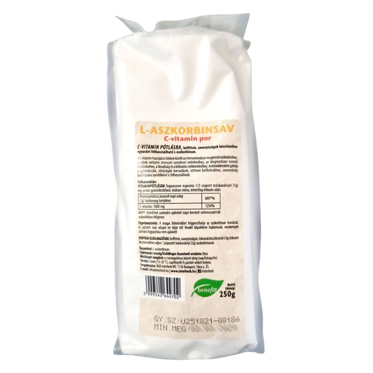 VITAMINPÓTLÁSRA fogyasszon naponta 1/3 csapott teáskanálnyit (1g) egy pohár gyümölcslében, teában oldva, lehetőleg étkezés után. KONYHAI ALKALMAZÁSA: befőttek, savanyúságok, lekvárok készítésénél 5 kg hőkezelt készítményhez adjon 1 púpozott teáskanálnyi (5g) aszkorbinsavat.