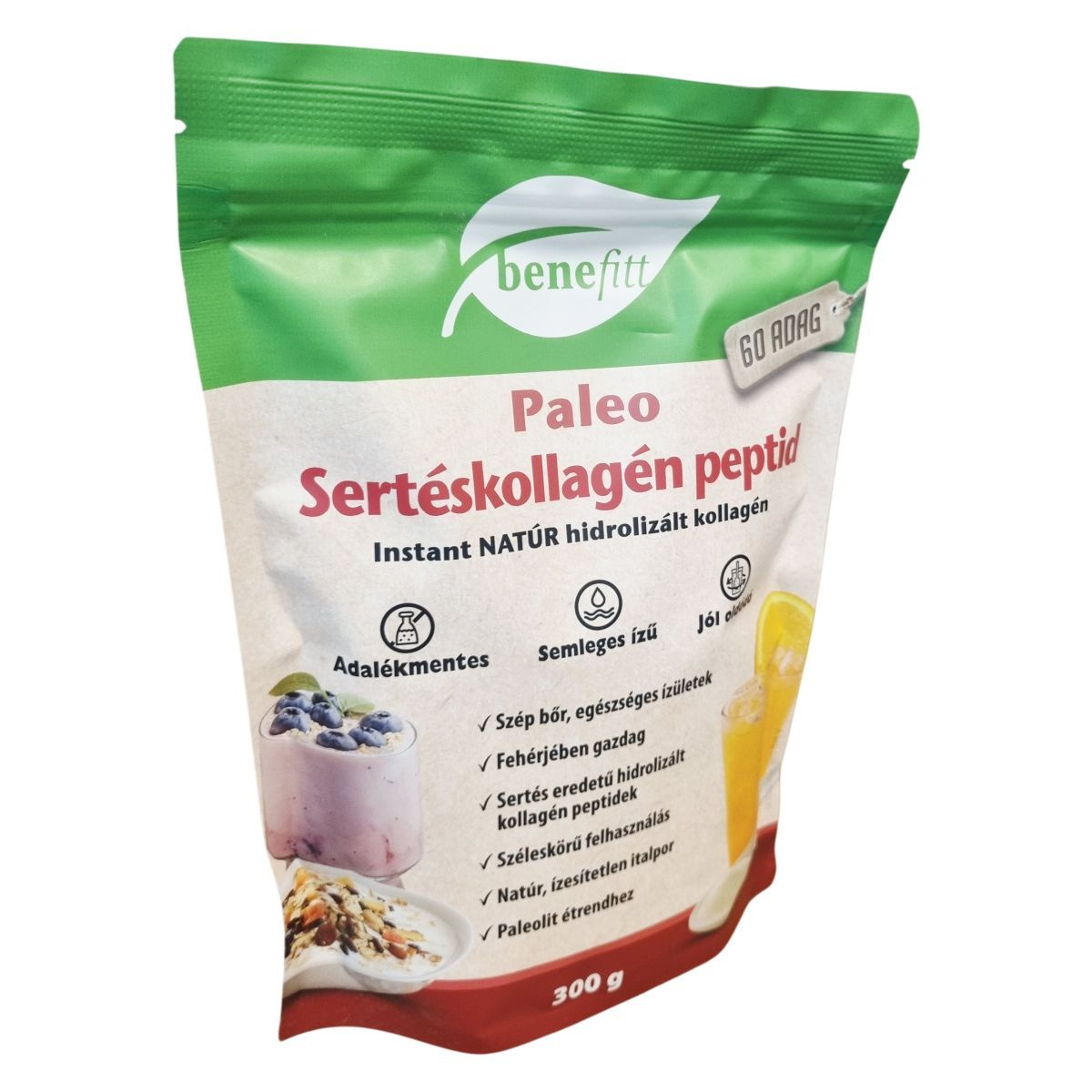 A benefitt Paleo Sertéskollagén peptid egy adalékmentes, natúr, ízesítetlen italpor, amely sertés eredetű hidrolizált kollagén peptideket tartalmaz. Fehérjében gazdag termék, amely hideg és meleg italokban egyaránt jól oldódik, és természetes módon glutén- valamint laktózmentes. Széles körben használható, akár teában, vízben, gyümölcslében vagy joghurtban is fogyasztható, és alkalmas paleolit étrendhez. Az előállító üzem nem használ fel búzát, gluténforrást, szóját, tojást, tej- és tejszármazékokat, ezáltal segíthet az allergének elkerülésében. A termék csomagolóanyaga 100%-ban újrahasznosítható, így környezettudatos választás lehet.