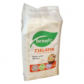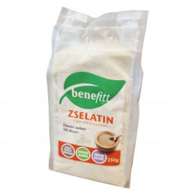 A benefitt étkezési zselatin egy magas fehérjetartalmú, hidegen oldódó termék, amely főzés nélküli sűrítésre alkalmas. Kiválóan használható konyhai alkalmazásokhoz, mint zselék, aszpikok vagy lekvárok készítése, de étrend-kiegészítőként is ideális, különösen időseknek, sportolóknak és fizikai munkát végzőknek. Külsőleges alkalmazásra is ajánlott, például ízületi pakoláshoz. A zselatin 100%-ban szarvasmarha eredetű, étkezési minőségű. Származási országa Brazília vagy Törökország, amely a gyártási szám első számjegyéből azonosítható. A termék csomagolása 250 g nettó tömegű, csomagolása nap/hónap/év formátumban jelezve tartalmazza a minőségmegőrzési időt.