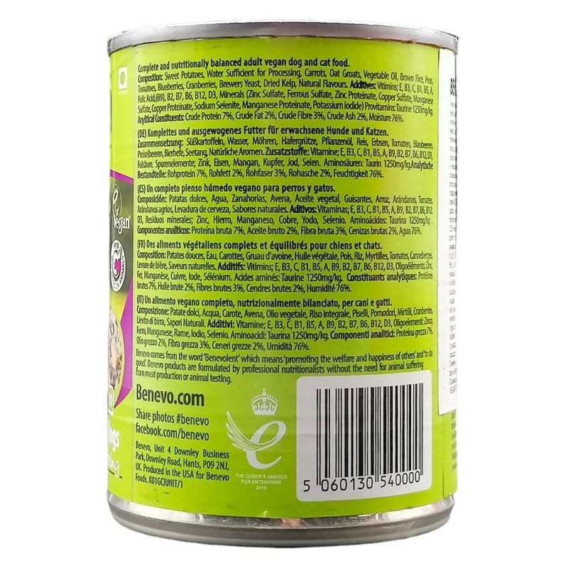 A Benevo Duo egy ízletes és könnyen emészthető, kisállat dietetikai szakértők által kidolgozott vegán eledel, mely mentes az állati eredetű összetevőktől, mesterséges ízfokozóktól vagy színezékektől. Nem tartalmaz húst, halat, szóját, búzát és tejtermékeket, melyek a leggyakoribb allergének. Vegán taurint tartalmaz, ami előnyös a kutyáknak, és nélkülözhetetlen a macskák számára. Összetétel: édesburgonya, a feldolgozáshoz szükséges mennyiségű víz, répa, zabdara, növényi olaj, barna rizs, borsó, paradicsom, kék áfonya, vörös áfonya, sörélesztő, szárított tengeri moszat, természetes aromák. Adalékok: Vitaminok: E, B3, C, B1, B5, A, folsav (B9), B2, B7, B6, B12, D3, ásványi anyagok (cink-szulfát, vas-szulfát, cink-proteinát, réz-szulfát, mangán-szulfát, réz-proteinát, nátrium-szelenit, mangán-proteinát, kálium-jodid), Provitaminok: taurin: 1250 mg/kg. Analitikai összetétel: nyersfehérje: 7%, nyersolajok és -zsírok: 2%, nyersrost: 3%, nyershamu: 2%, nedvesség: 76%.