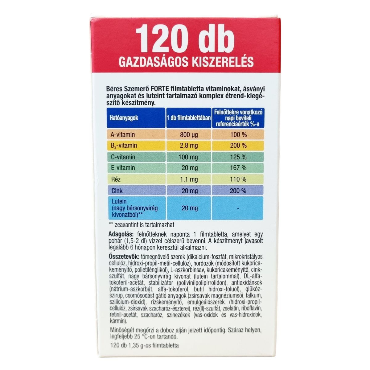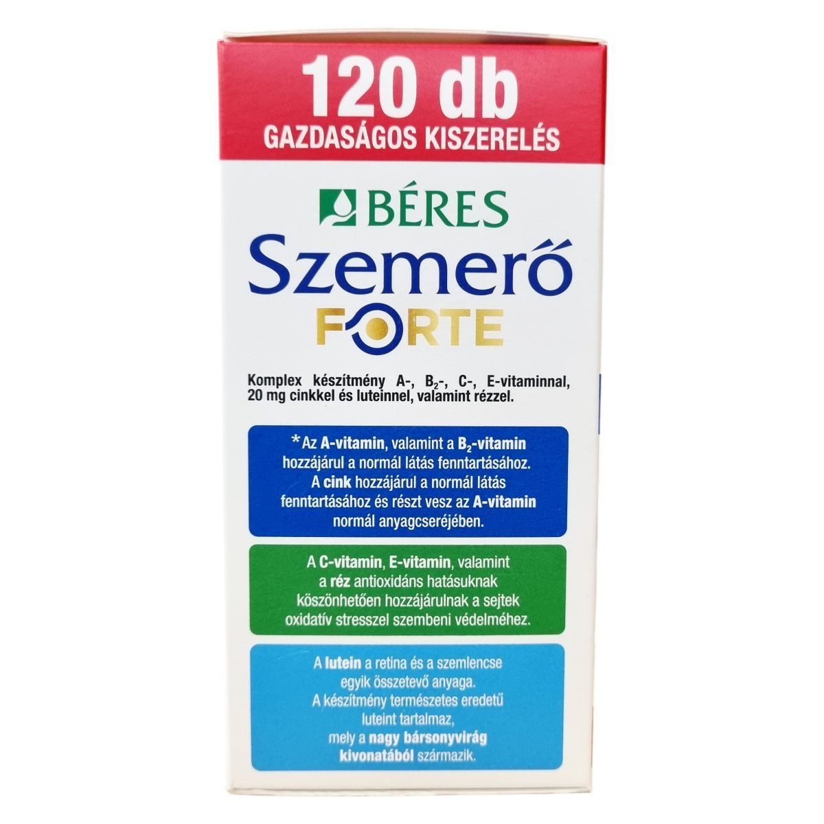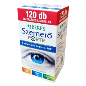 A Béres Szemerő FORTE filmtabletta vitaminokat, ásványi anyagokat és luteint tartalmazó komplex étrend-kiegészítő készítmény, amelyben az A-vitamin és a B2-vitamin hozzájárulhat a normál látás fenntartásához. A cink szintén hozzájárulhat a normál látás fenntartásához és részt vehet az A-vitamin normál anyagcseréjében. A C- és E-vitamin, valamint a réz antioxidáns hatásuk révén támogathatják a sejtek oxidatív stresszel szembeni védelmét. A készítmény természetes eredetű luteint tartalmaz, amely a retina és a szemlencse egyik fontos összetevője, és nagy bársonyvirág kivonatából származik. A termék különösen javasolt a megfelelő látás fenntartásáért, rossz világítási viszonyok között dolgozóknak, valamint gyakori képernyőhasználat mellett. A filmtabletták gazdaságos kiszerelésben, 120 darabos csomagban érhetők el.