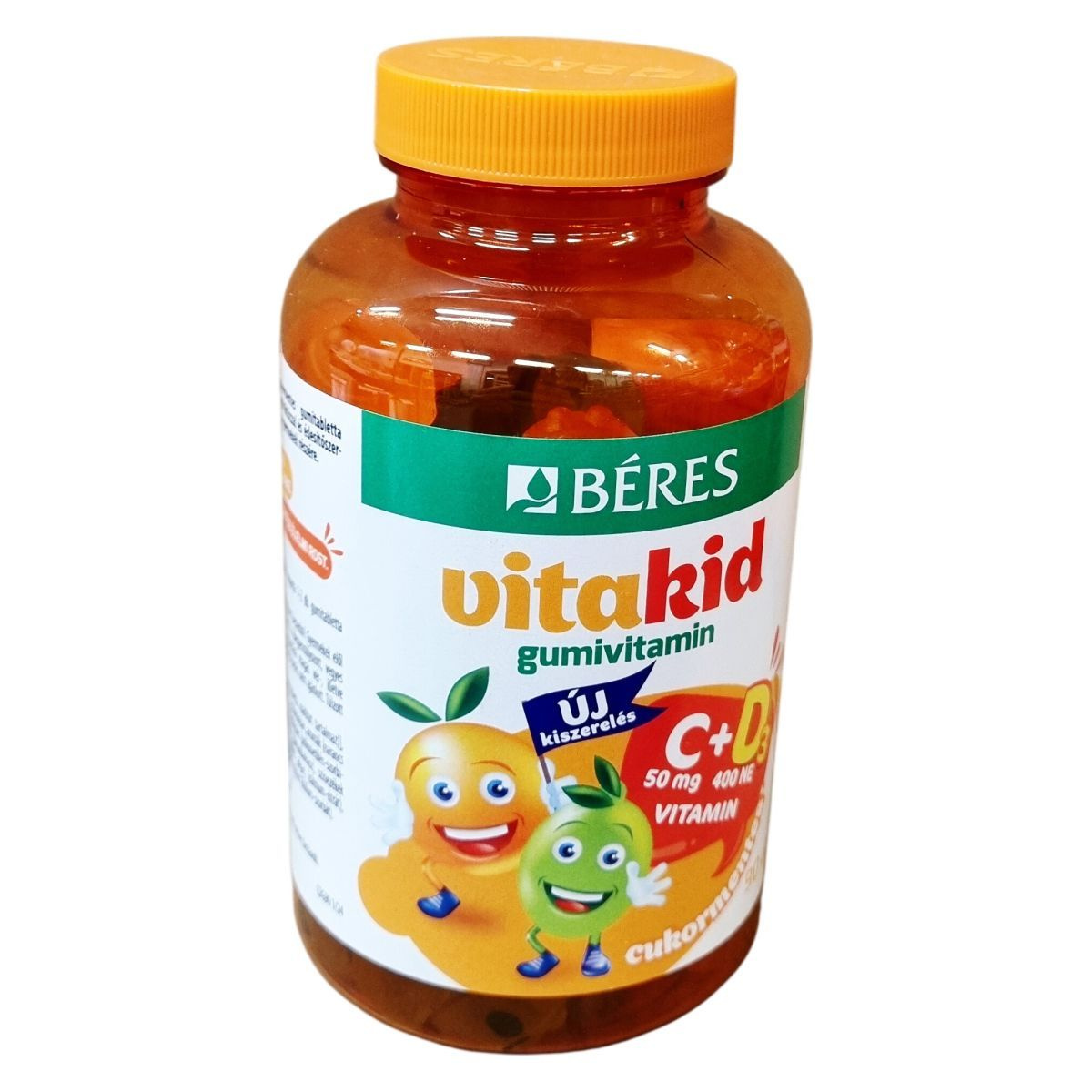 Cukormentes gumitabletta étrend-kiegészítő C- és D3 -vitaminnal, oligofruktózzal és édesítőszerrel, finom lime és narancs ízben, elsősorban gyermekek részére.