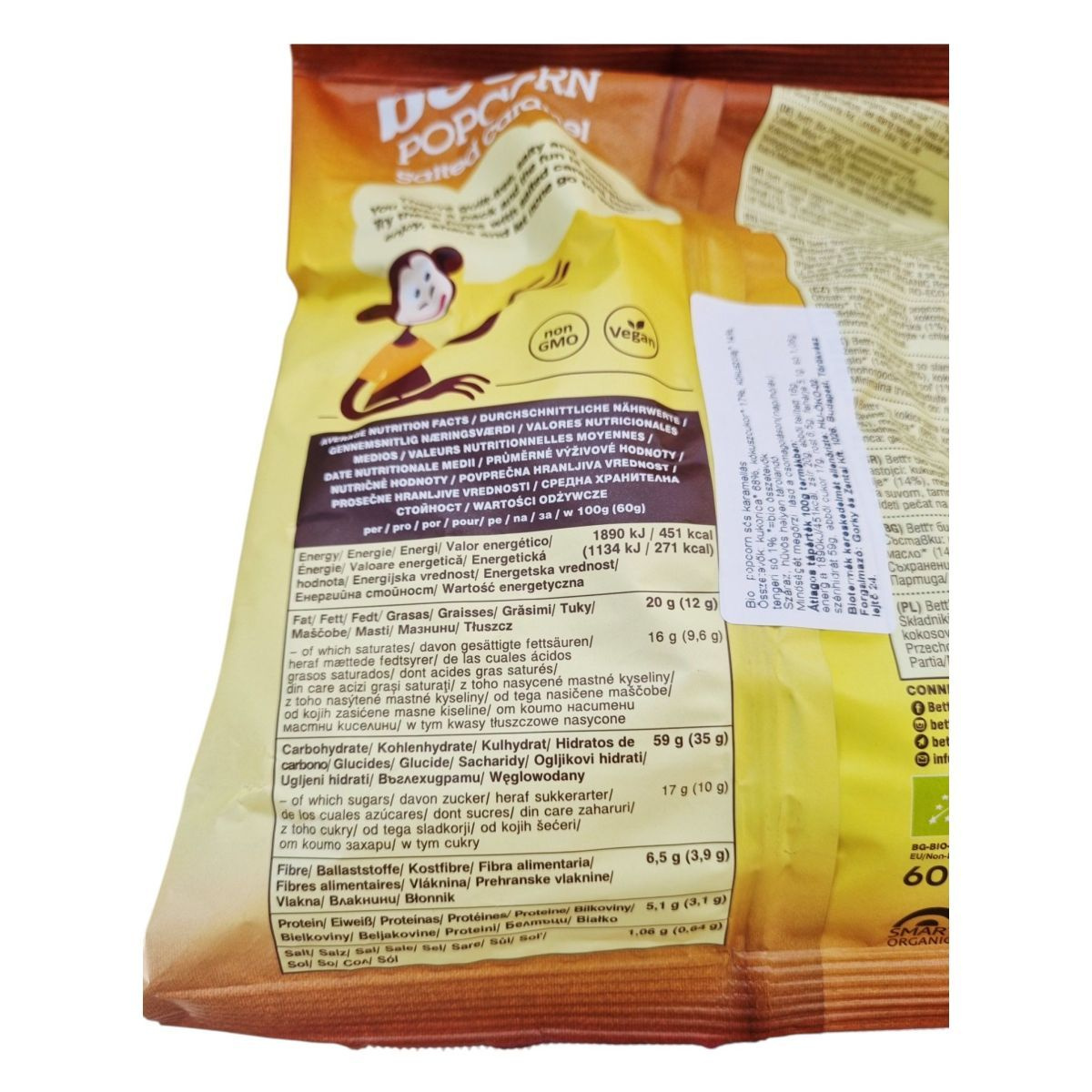 A bett'r sós karamellás popcornja bio és vegán, amely kókuszolajjal készül. Élvezd a sós és édes ízek tökéletes harmóniáját bűntudat nélkül!