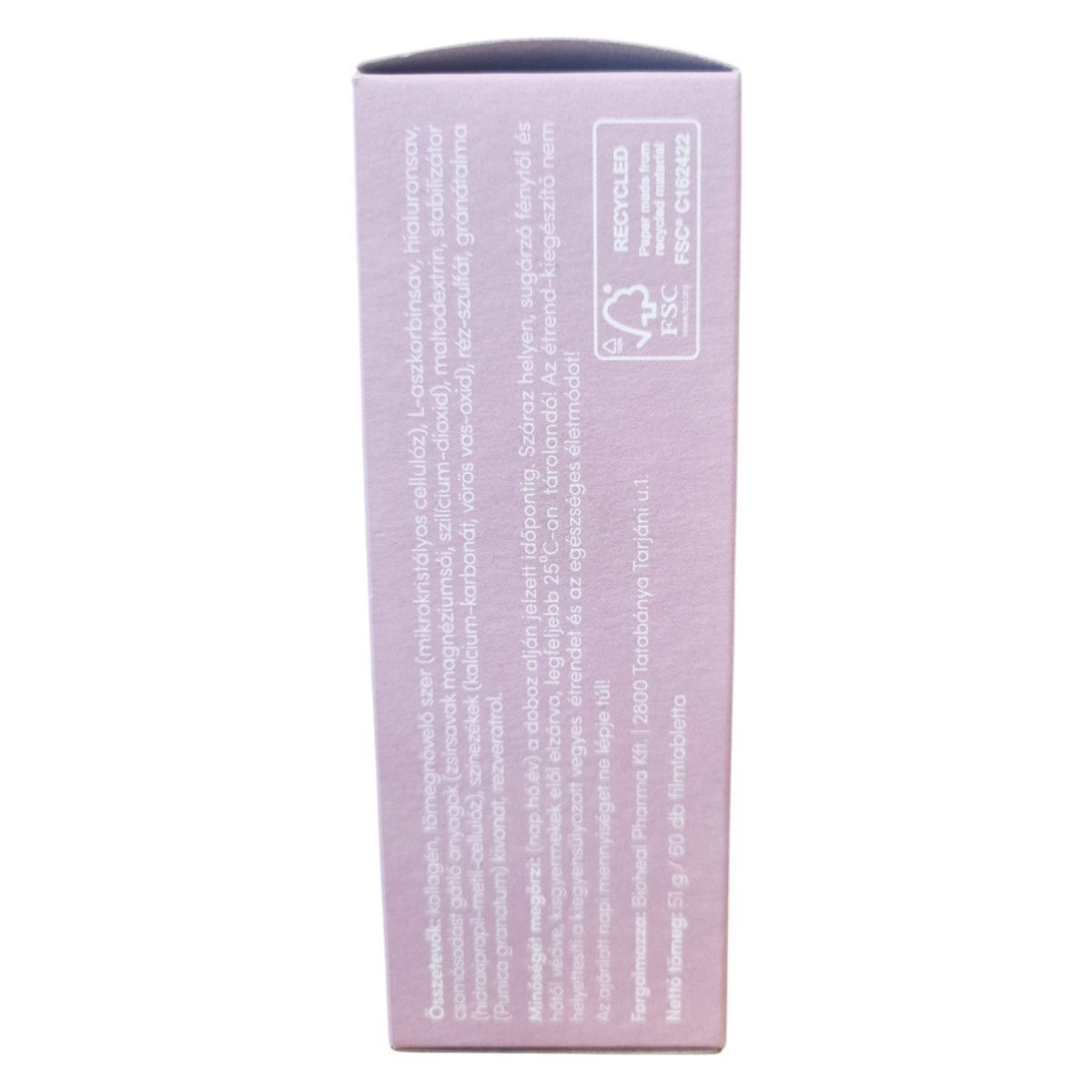 A Bioheal Kollagén & Hialuronsav étrend-kiegészítő filmtabletta kollagént, hialuronsavat, C-vitamint, rezet, rezveratrolt és gránátalma kivonatot tartalmazhat, amelyek hozzájárulhatnak a bőr normál állapotának fenntartásához.