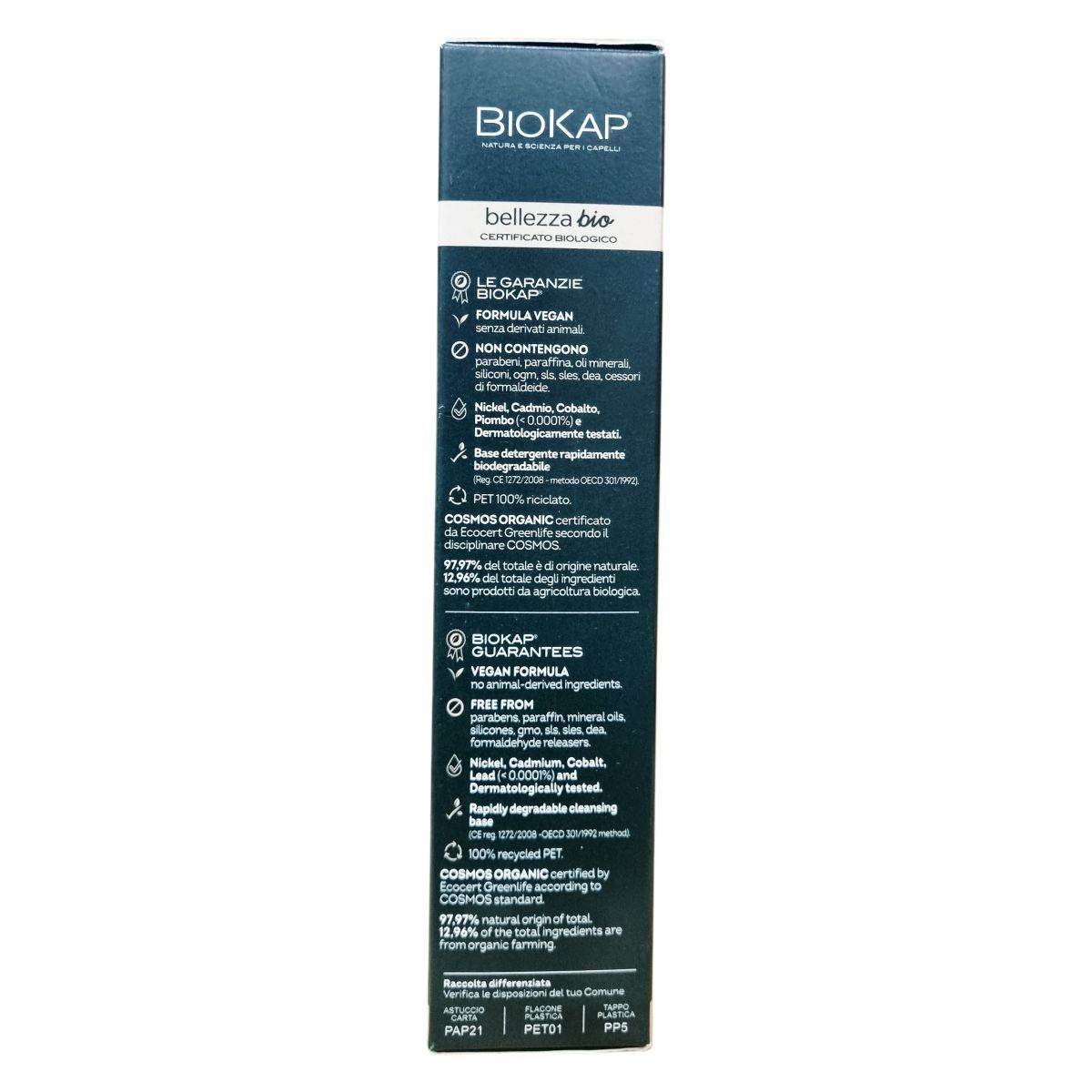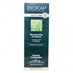 A Biokap erősítő sampon különleges hatóanyagokat tartalmaz, melyek között a kurkuma rizóma peptidei és a mezei zsurló kivonat, mely gazdag szilíciumban, a hajszálakat revitalizálja és erősíti, így a haj dúsabb, volumentelibb hatású lesz. A termék növényi eredetű kókuszolaj alapú felületaktív anyagokat használ, amelyek gyengéden tisztítanak, megőrizve a fejbőr természetes egyensúlyát. A sampon 97,97%-ban természetes eredetű összetevőket tartalmaz, melyekből 12,96% bio gazdaságból származik. A termék vegán, parabén-, paraffin-, ásványi olaj-, szilikon-, GMO-mentes, és dermatológiailag tesztelt. A csomagolás 100%-ban újrahasznosított PET anyagból készült, és megfelel a COSMOS ORGANIC szabványoknak, melyet az Ecocert Greenlife tanúsít. A sampon használata hozzájárul a haj egészségéhez, megfelelő gondoskodást nyújtva a mindennapi hajápolásban.