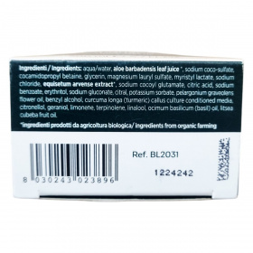 aqua/water, aloe barbadensis leaf juice*, sodium coco-sulfate, cocamidopropyl betaine, glycerin, magnesium lauryl sulfate, myristyl lactate, sodium chloride, equisetum arvense extract*, sodium cocoyl glutamate, citric acid, sodium benzoate, erythritol, sodium gluconate, citral, potassium sorbate, pelargonium graveolens flower oil, benzyl alcohol, curcuma longa (turmeric) callus culture conditioned media, citronellol, geraniol, limonene, terpinolene, linalool, ocimum basilicum (basil) oil, litsea cubeba fruit oil.