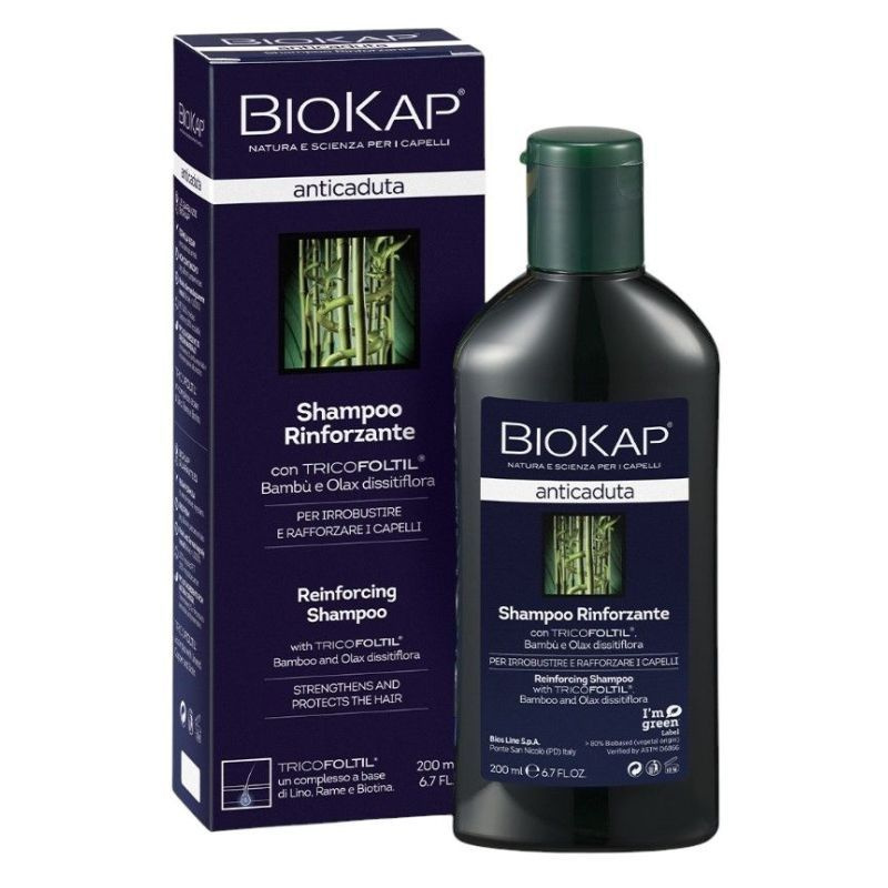 A BioKap Anticaduta (hajhullás elleni) erősítő sampon kifejezetten a haj megerősítésére kifejlesztett kozmetikai kezelés, amely férfiak és nők számára egyaránt alkalmazható. Hatékony olyan időszakokban, amikor a haj törékeny vagy hajhullásra hajlamos, stressz, diéta illetve hormonális változások esetén. Kíméletes formulával rendelkezik, mindennapi használatra is alkalmas. A Tricofoltil komplex (len, réz és biotin alapú) mellett tartalmaz fűrészpálmát, tökmagot, Olax dissitiflora és szilíciumban gazdag bambusz kivonatot is. Mentollal és csalánnal dúsítva a dermó-tisztító hatás érdekében, valamint organikus rozmaring és melaleuca illóolajokkal, amelyek segítenek a fejbőr hajszálereinek stimulálásában.