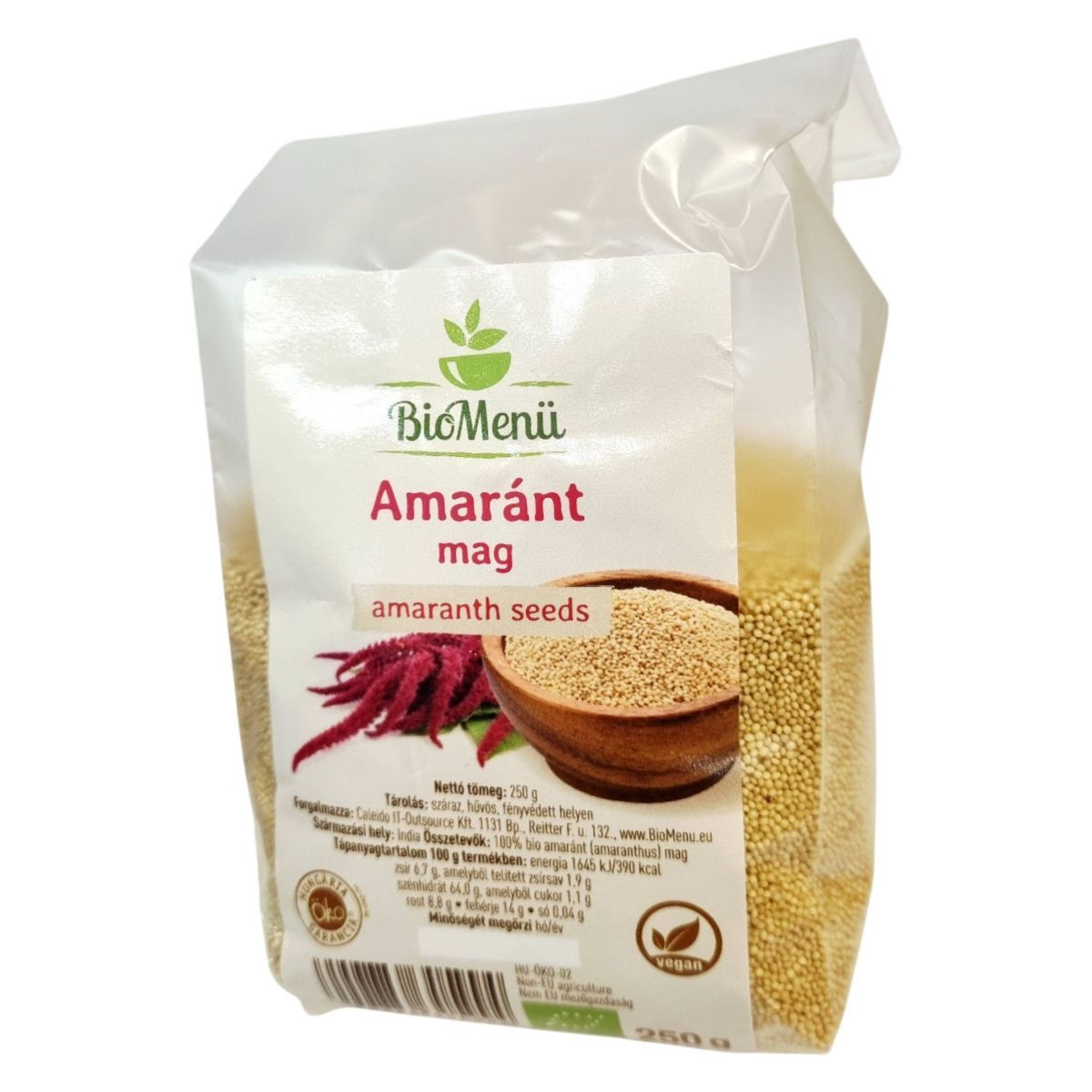 A BioMenü Amaránt mag 100% bio amarántot tartalmaz, amely Indiából származik. A termék vegán és bio minősítéssel rendelkezik, és ideális választás különféle étrendi irányzatok követőinek.