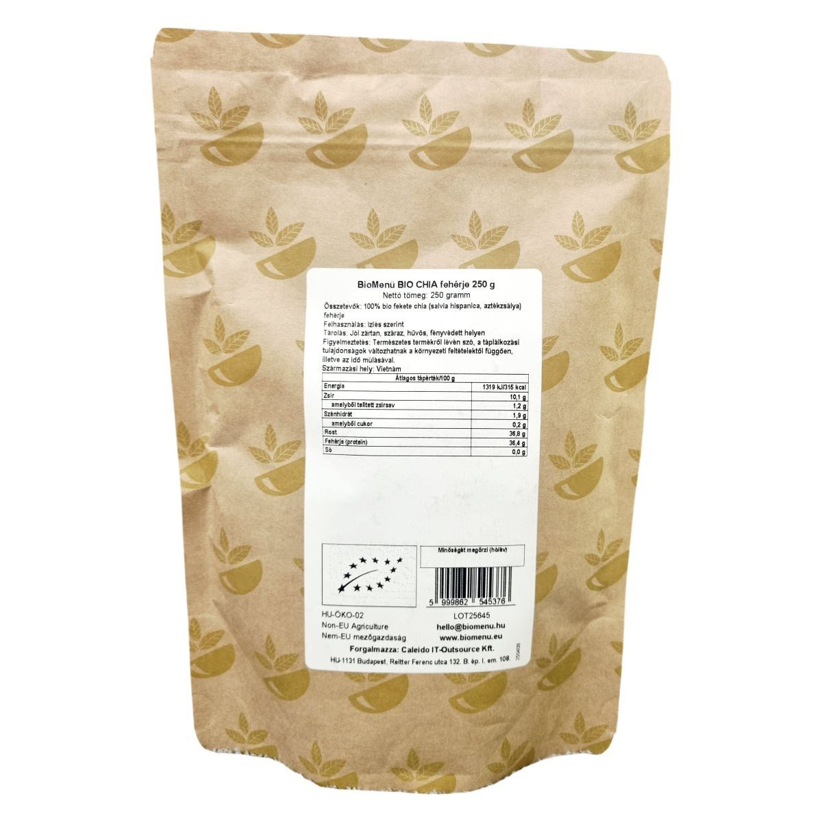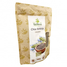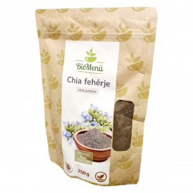 A BioMenü BIO CHIA fehérje 250 grammos kiszerelésben kapható, Vietnámból származó, 100%-ban organikus fekete chia magból készül. A termék nyers, vegán és bio minősítésű, így számos étrendi irányzatba beilleszthető. A magas rost- és fehérjetartalom mellett természetes zsírokat és alacsony cukortartalmat kínál. A csomagoláson szerepel a HU-ÖKO-02 minősítési kód és az információ a nem EU mezőgazdaságból származásról. A termék természetes jellege miatt a tápértékek változhatnak a környezeti feltételek és az idő múlása függvényében.