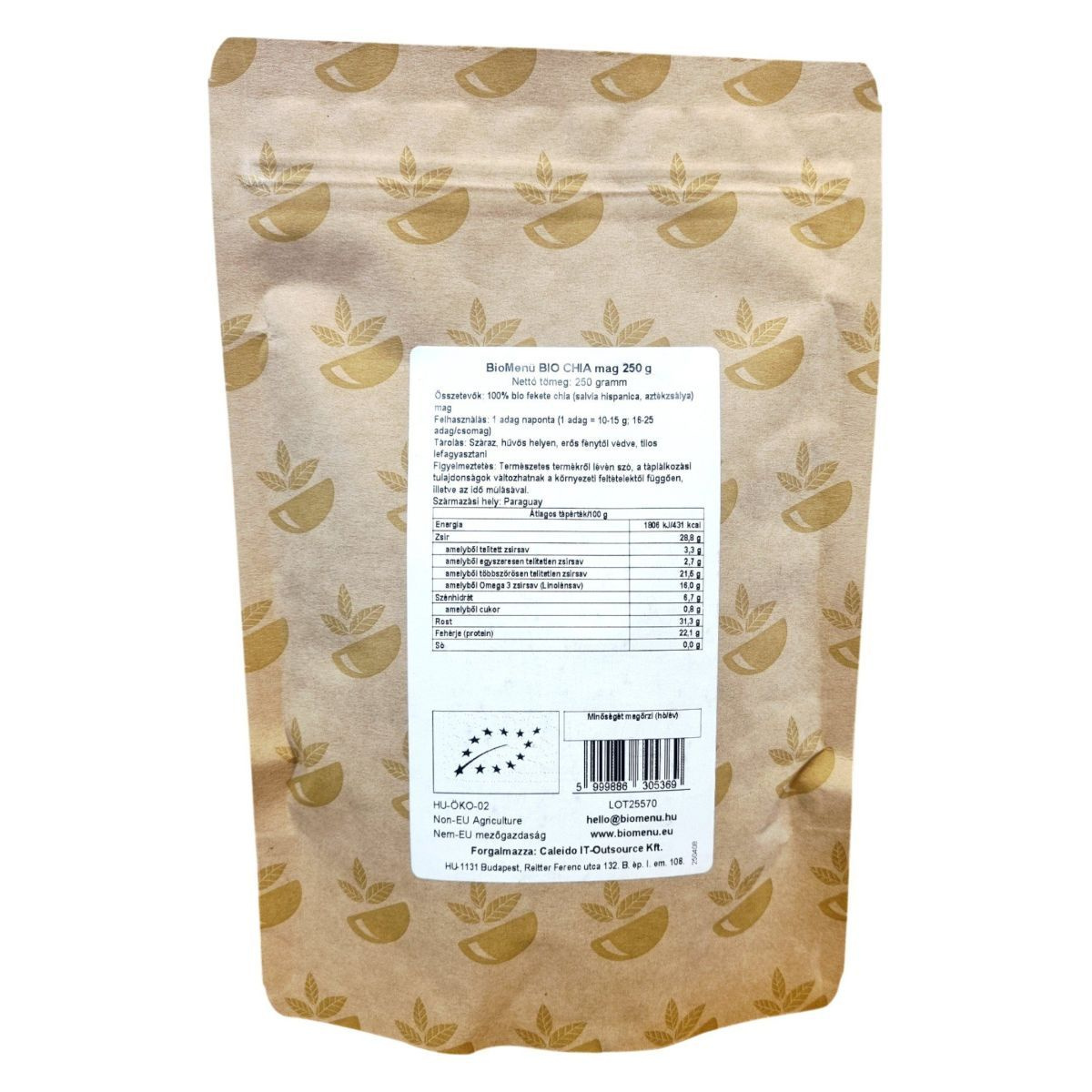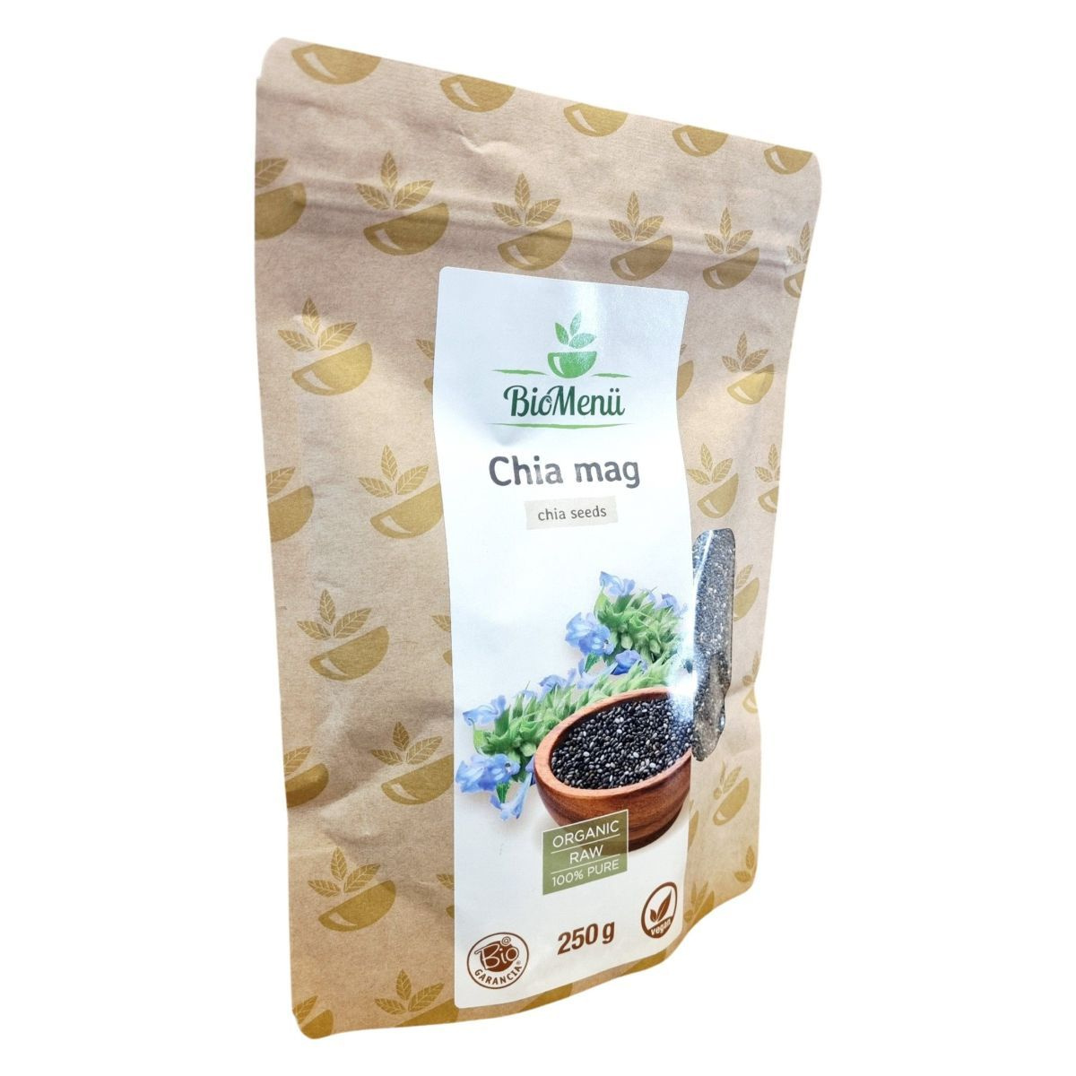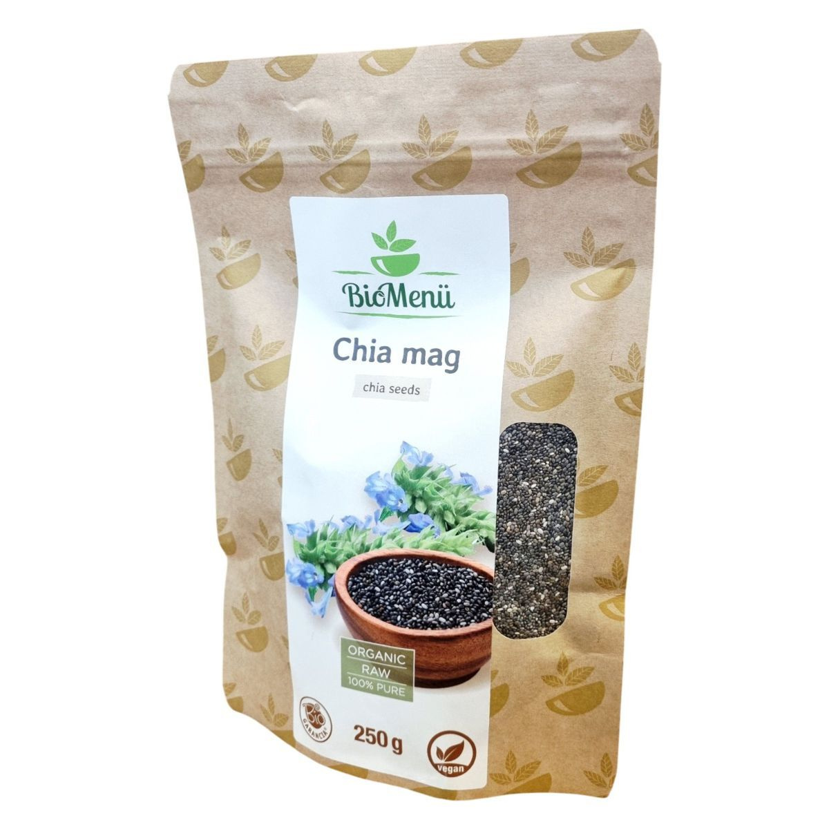 A BioMenü BIO CHIA mag egy 250 grammos kiszerelésű, 100% bio fekete chia magot tartalmazó termék, amely Paraguayból származik. A chia magok gazdagok Omega 3 zsírsavakban, rostokban és fehérjében, így kiváló kiegészítői lehetnek az egészséges étrendnek. A termék organikus, nyers és vegán, így különféle étrendi irányzatok követői számára is ideális választás. A chia magokat naponta 10-15 grammos adagokban ajánlott fogyasztani. Tárolása száraz, hűvös helyen, erős fénytől védve javasolt, és tilos lefagyasztani. A termék természetes jellege miatt a táplálkozási tulajdonságok változhatnak a környezeti feltételektől függően.