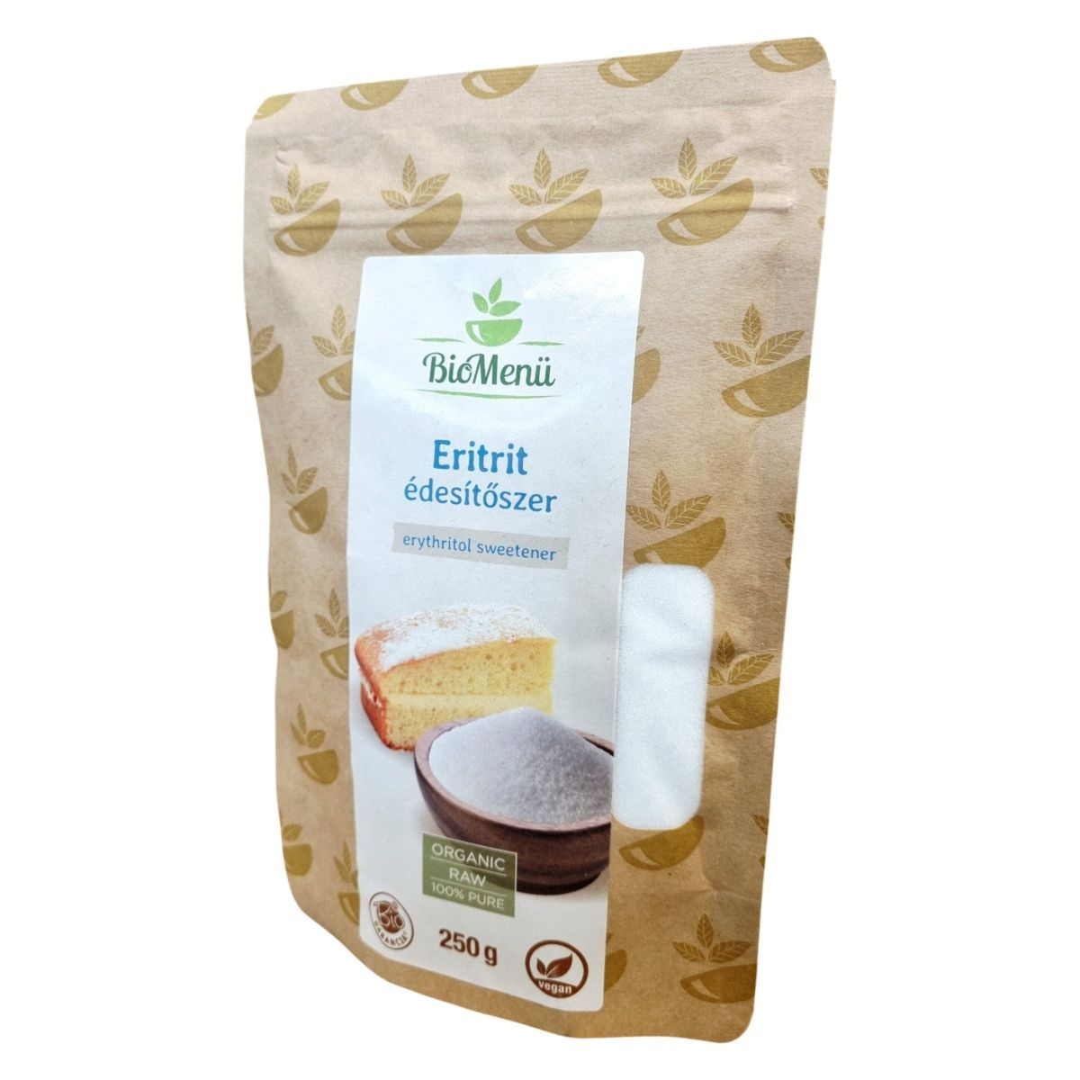 A BioMenü BIO ERITRIT édesítőszer egy 100% tiszta, organikus eritrit, amely Kínából származik. A termék nem tartalmaz zsírt, fehérjét vagy sót, és szénhidráttartalma szinte teljes egészében poliolokból áll. Az eritrit ideális választás azok számára, akik cukormentes alternatívát keresnek. A termék minőségét a HU-ÖKO-02 tanúsítvány garantálja, és a Caleido IT-Outsource Kft. forgalmazza Magyarországon.