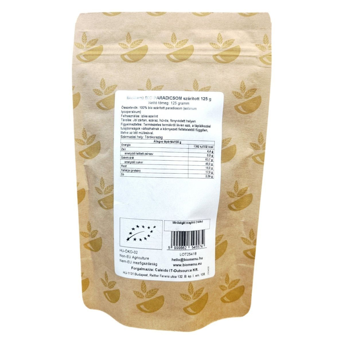 A BioMenü BIO PARADICSOM szárított termék 125 grammos kiszerelésben kapható, és 100% bio szárított paradicsomból készül. A termék Törökországból származik, és megfelel a bio, raw és vegán étrendi irányzatoknak. Az energia- és tápérték adatok alapján a termék gazdag szénhidrátban és rostban, miközben alacsony a telített zsírsav tartalma. A termék tárolása során fontos, hogy jól zártan, száraz, hűvös és fényvédett helyen tartsuk. A termék természetes jellege miatt a táplálkozási tulajdonságok változhatnak a környezeti feltételektől függően. A forgalmazó a Caleido IT-Outsource Kft., és a termék rendelkezik HU-ÖKO-02 tanúsítvánnyal.