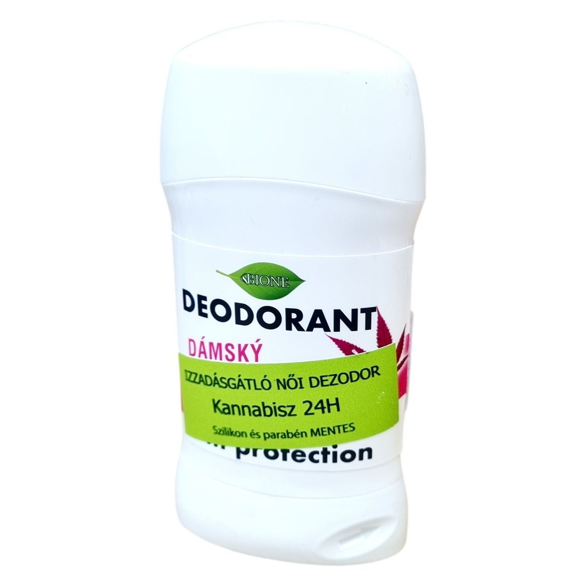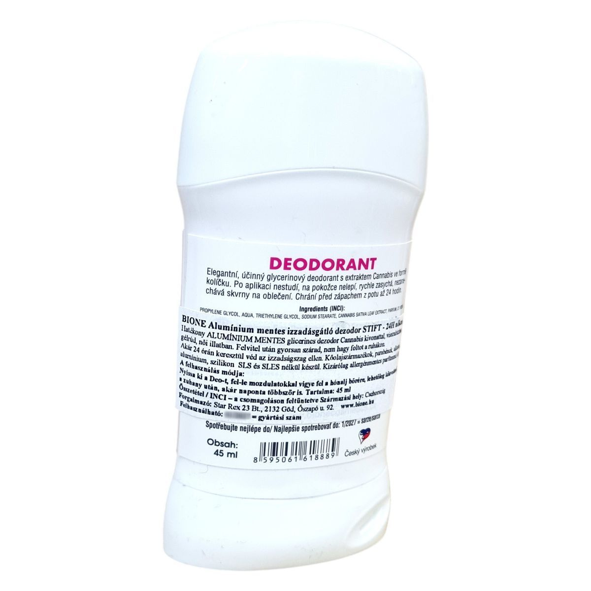 A BIONE Cannbisz 24H izzadásgátló női dezodor stift formátumban kapható, könnyű és gyorsan száradó formulával. Használat után nem hűsít túlzottan, nem ragad a bőrön, és nem hagy foltot a ruhákon. A termék természetes alapanyagokat tartalmaz, melyek hatásosan védenek a kellemetlen testszag kialakulása ellen egész nap. Az 45 ml-es kiszerelés praktikus és könnyen hordozható. Magyar nyelvű és cseh gyártású kozmetikum.