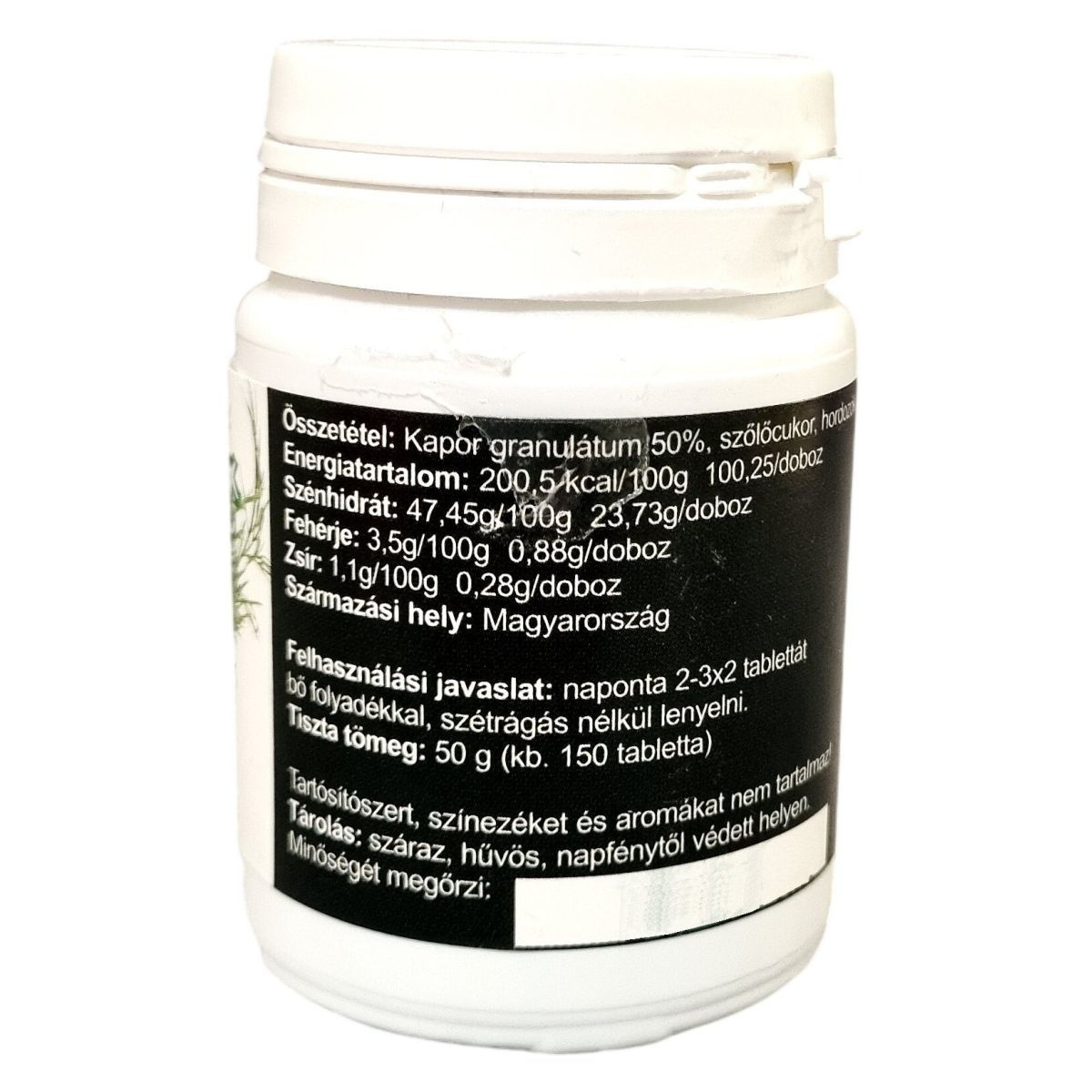 A termék Magyarországon készül, tiszta tömege 50 g, amely körülbelül 150 tablettát tartalmaz. A tabletták kapor granulátum és szőlőcukor alkotják, amelyek természetes összetevők. A termékben nem találhatók tartósítószerek, színezékek vagy aromák, így természetes összetételű. A napi ajánlott fogyasztás 2-3 alkalommal, alkalmanként 2 tabletta, amelyeket bő folyadékkal kell lenyelni, szétrágás nélkül.