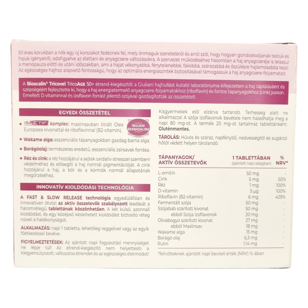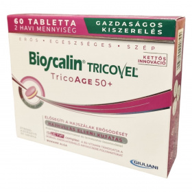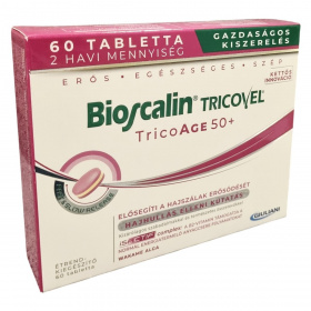 A Bioscalin® Tricovel TricoAGE 50+ étrend-kiegészítőt kifejezetten a 50 év feletti nők igényeihez fejlesztették ki, támogatva hajuk egészségét a menopauza előtti és utáni változások során. A termék összetétele tartalmaz iSACTIF komplexet, mely riboflavint és maslinsavban titralt olíva kivonatot foglal magában, valamint wakame algát, amely esszenciális tápanyagokat biztosít, továbbá borágóolajat, ami természetes esszenciális zsírsavforrás. A réz hozzájárulhat a sejtek oxidatív stresszel szembeni védelméhez és a haj normál pigmentációjához, míg a cink a haj, bőr és körmök normál állapotának megőrzéséhez. A FAST & SLOW RELEASE technológia a háromrétegű tablettának köszönhetően szabályozottan és fokozatosan bocsátja ki az aktív összetevőket, így növelve a hatékonyságot. A termék gluténmentes, és kizárólag minőségi, szabadalmaztatott aktív összetevőket tartalmaz, melyek tudományos kutatásokon alapulnak. Az alkalmazás során figyelembe kell venni az ajánlott napi adagot, és a termék nem helyettesítheti a változatos étrendet és az egészséges életmódot.