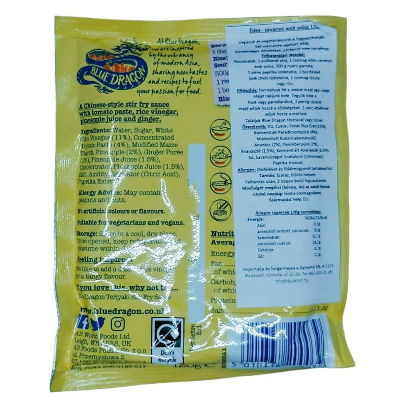 2 személyre ajánlott adag. Mesterséges színezéket, ízfokozót nem tartalmaz. Felhasználási javaslat: Hozzávalók: 1 evőkanál olaj, 1 csomag édes savanyú wok szósz, 300 g nyers garnéla, 1 piros paprika szeletelve, 1 bordáskel ( pak choi) szeletelve, 1 csomag tészta vagy rizs. Elkészítés: Forrósítsuk fel a wokot majd egy csepp olajat rakjunk bele. Rakjuk bele a húst vagy garnélarákot, 3 percig süssük majd adjuk hozzá a zöldségeket. 1 perc elteltével adjuk hozzá a mártást. Tálaljuk Blue Dragon tésztával vagy rizzsel. Összetevők: Víz, Cukor, Fehér Rizs Ecet (11%), Koncentrált Paradicsompüré (4%), Módosított Kukoricakeményítő, Ananász (2%), Gyömbérpüré (2%), Ananászlé (1,5%), Koncentrált Ananászlé (1,5%), Só, Savanyúságot Szabályzó (Citromsav), Paprika kivonat. Allergén: Dióféléket és földimogyorót tartalmazhat. Tárolás: Száraz, hűvös helyen. Felbontás után, 2 napon belül fogyasztandó.