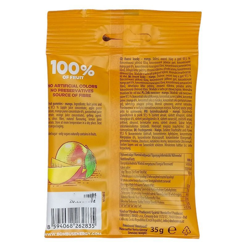 Sűrített almalé, sűrített almapüré, sűrített mangópüré 6%, sűrített passiógyümölcs lé,sűrített narancslé zselésítő anyag: pektinek, citrusrost, természetes aroma, sűrített citromlé. Gyümölcscukorkák-mangó: gyümölcslevek és pürék 97,5% (sűrített almalé, sűrített almapüré, sűrített mangópüré 6%, sűrített passiógyümölcs lé,sűrített narancslé) zselésítő anyag: pektinek, citrusrost, természetes aroma, sűrített citromlé.