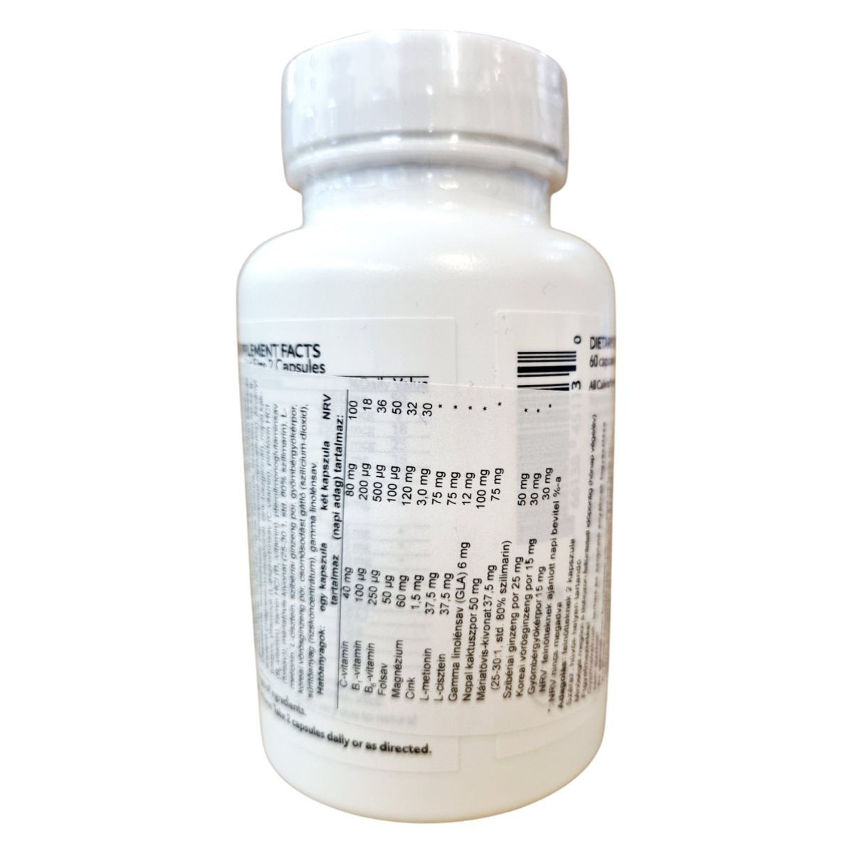 Növényi kapszula (hidroxipropil-metil-cellulóz), C-vitamin, E-vitamin, L-metionin, ásványi anyagok (magnézium, cink), növényi kivonatok (ginzeng, zöld tea, rozmaring, szőlőmag), emulgeálószer (szilícium-dioxid).