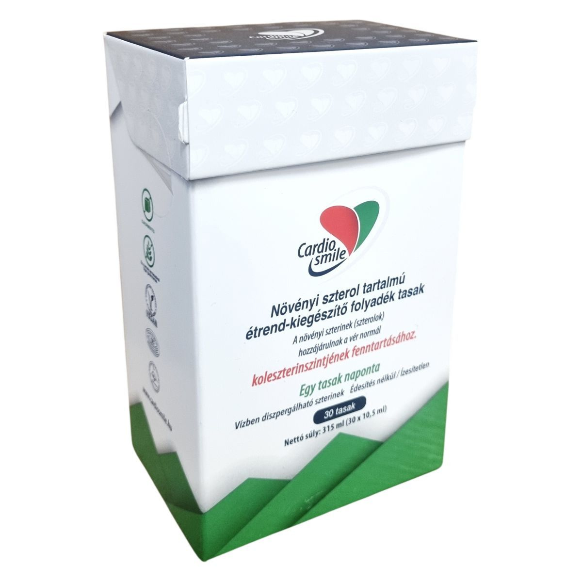 A Cardiosmile egy szabadalmaztatott, klinikailag tesztelt, nanopartikuláris diszperziós technológián alapuló vízoldékony formula, amely vízbázisú növényi szterol készítményt tartalmaz. A termék 2 gramm növényi szterolt biztosít tasakonként, amely hozzájárulhat a normál vérkoleszterinszint fenntartásához. A magas koleszterinszint rizikófaktora lehet a szívkoszorúér-betegség kialakulásának, ezért a termék fogyasztása támogathatja a koleszterinszint szabályozását. A termék édesítés és ízesítés nélkül készült, így bármilyen hideg vagy meleg italhoz vagy ételhez adható. Használat előtt a tasak felrázandó, majd közvetlenül elfogyasztható vagy az ételbe keverhető. A termék kizárólag azok számára ajánlott, akiknek szükségük van ilyen étrend-kiegészítőre, és nem pótolja a kiegyensúlyozott étrendet vagy az egészséges életmódot.