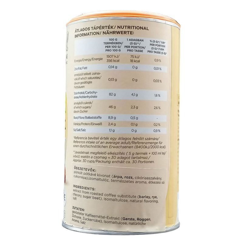 Összetevők: pörkölt pótkávé kivonat(árpa,rozs,cikóriaaszalvány,cukorrépa),izomaltulóz, természtes aroma,étkezési só,édesítőszer (setviol glycosides).