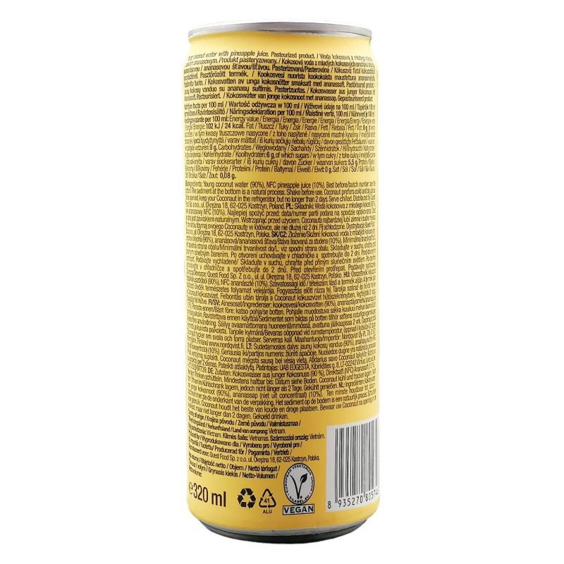 Kókuszvíz fiatal kókuszdióból (90%) NFC ananászlé (10 %), Antioxidáns: L-aszkorbinsav (c vitamin). Szavatossági idő/tételszám: lásd termék alján. A termék alján található üledék természetes folyamat velejárója. Tárolja száraz és hűvös helyen a Coconaut Kókuszvízet. Felbontás után tárolja a Coconaut kókuszvízet hűtőszekrényben, legfeljebb két napig. Szolgálja fel hűtve.