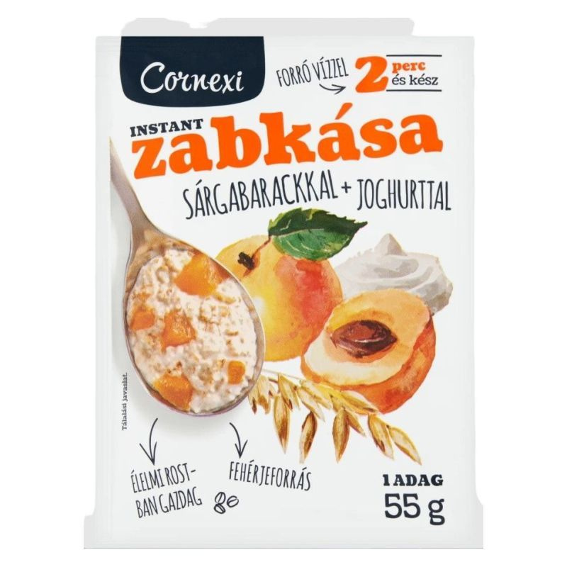 Összetevők: Zabpehely 65%; Cukor; Sovány tejpor; Aszalt sárgabarack apríték rizsliszttel 6,4% [(aszalt sárgabarack 85%, kén-dioxid), rizsliszt]; Joghurtpor 3,6%; Sűrítőanyag: gumiarábikum; Lenmag; Kukoricakeményítő; Étkezési só; Aroma; Étkezési sav: citromsav.