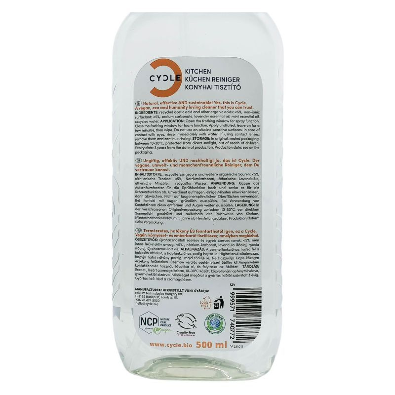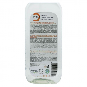 A CYCLE Konyhai tisztító a természetes felületaktív anyagainak és a szerves savaknak köszönhetően hatékonyan távolítja el a makacs szennyeződéseket a konyhai felületekről, legyen az a konyhapult, a konyhai csempe, hűtő vagy mikrohullámú sütő.