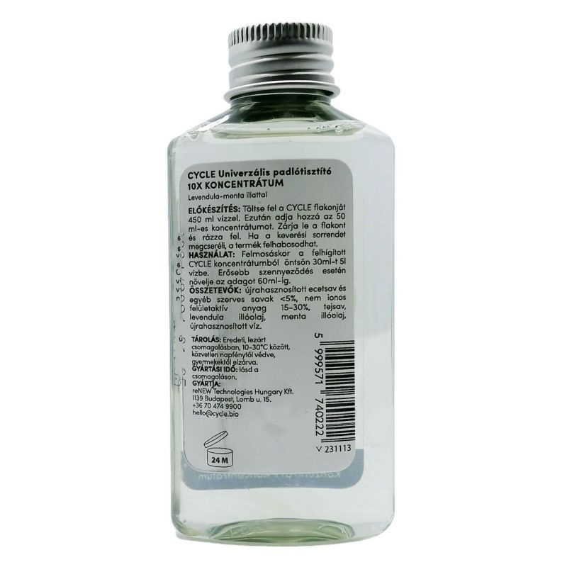 Használat: Felmosáskor a felhígított CYCLE koncentrátumból öntsön 30 ml-t 5 l vízbe. Erősebb szennyeződés esetén növelje az adagot 60 ml-ig. Ne használja savas közegre érzékeny felületeken (márvány, réz).