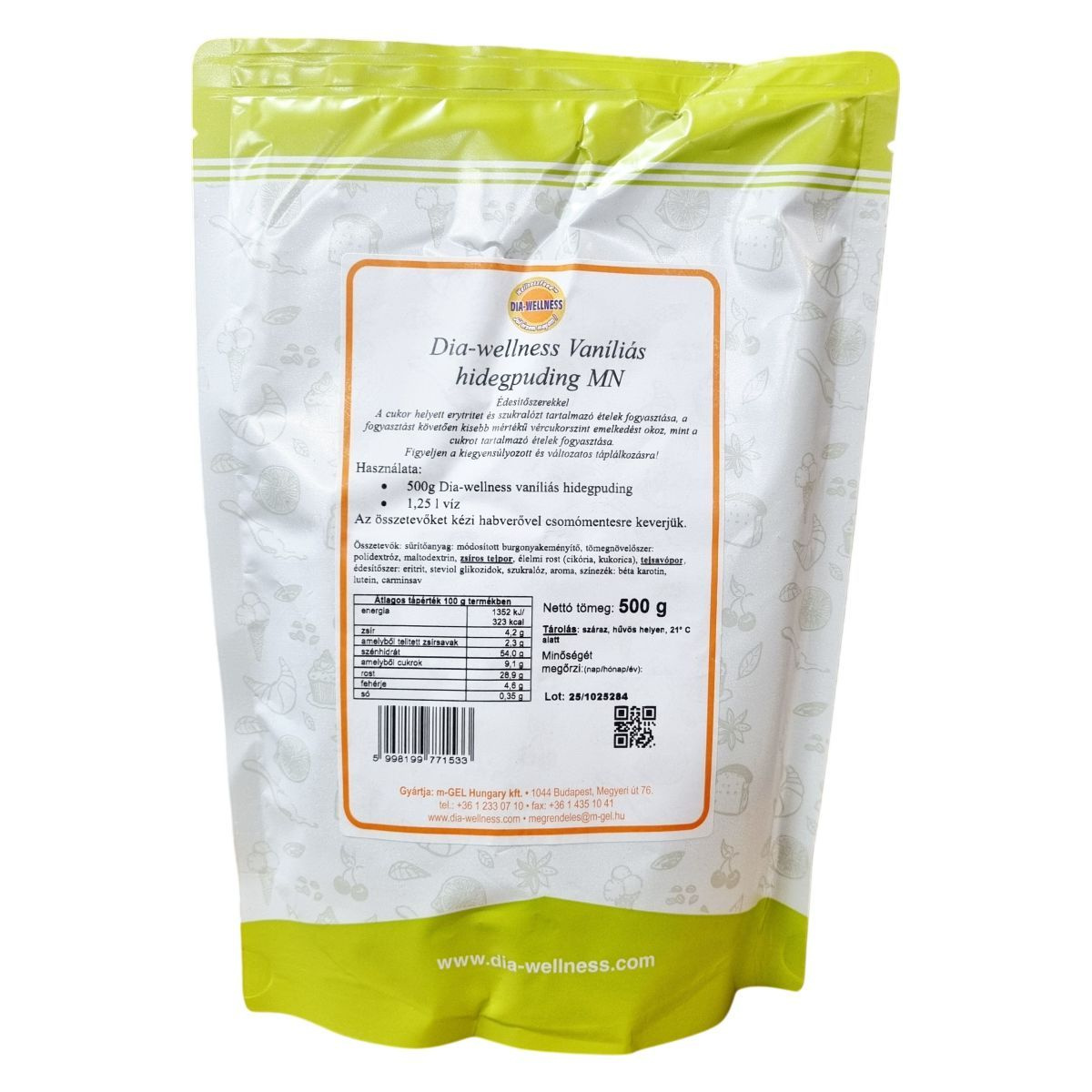 A Dia-wellness vaníliás hidegpuding cukorhelyettesítőkkel, eritrittel és szukralózzal édesített, csökkentett szénhidráttartalmú termék. Kiemelten gazdag élelmi rostokban, amelyek cikóriából és kukoricából származnak. Tartalmaz továbbá zsíros tejport, tejsavóport, valamint színezékeket, mint a béta-karotin, lutéin és karminsav. A sűrítésről módosított burgonyakeményítő gondoskodik, míg a polidextroz és maltodextrin a tömegnövelést szolgálják. A termék nettonettó tömege 500 g, megújult receptúrával készül, és hűvös, száraz helyen tárolandó. A doboz tartalmaz magyar nyelvű információkat az elkészítésről és az összetevőkről, valamint felhívja a figyelmet a kiegyensúlyozott táplálkozás fontosságára. A termék édesítése és összetétele miatt vércukorszint-emelkedése kisebb lehet, mint a hagyományos cukrot tartalmazó hidegpudingoké.