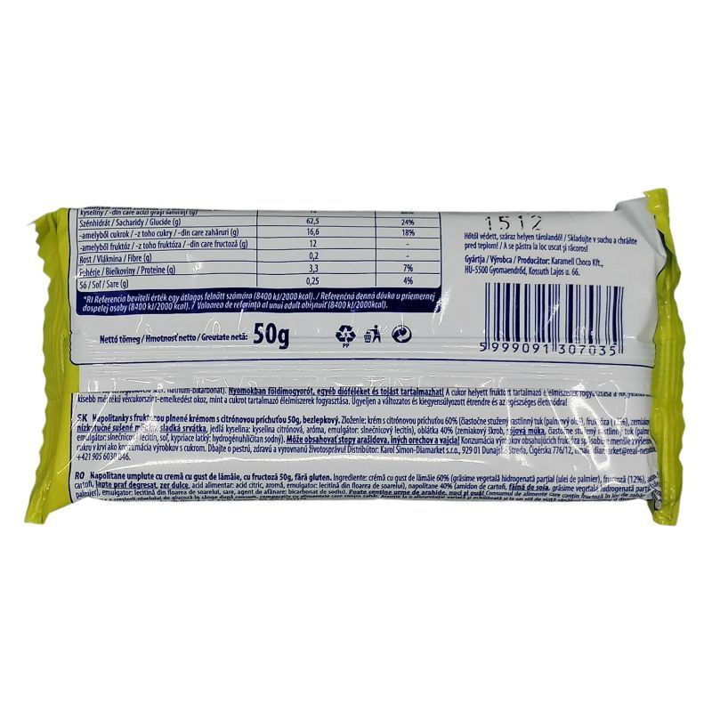 Összetevők: citromízű krém 60% (részben hidrogénezett növényi zsír (pálma), burgonya keményítő, sovány tejpor, édes tejsavópor, étkezési sav: citromsav, aroma, emulgeálószer: napraforgó lecitin, ostyalap 40% (burgonya keményítő, szójaliszt, részben hidrogénezett növényi zsír (pálma), emulgeálószerek: napraforgó lecitin, étkezési só, térfogatnövelőszer: nátrium-bikarbonát). Allergén információk: sovány tejpor, édes tejsavó por, szójaliszt.