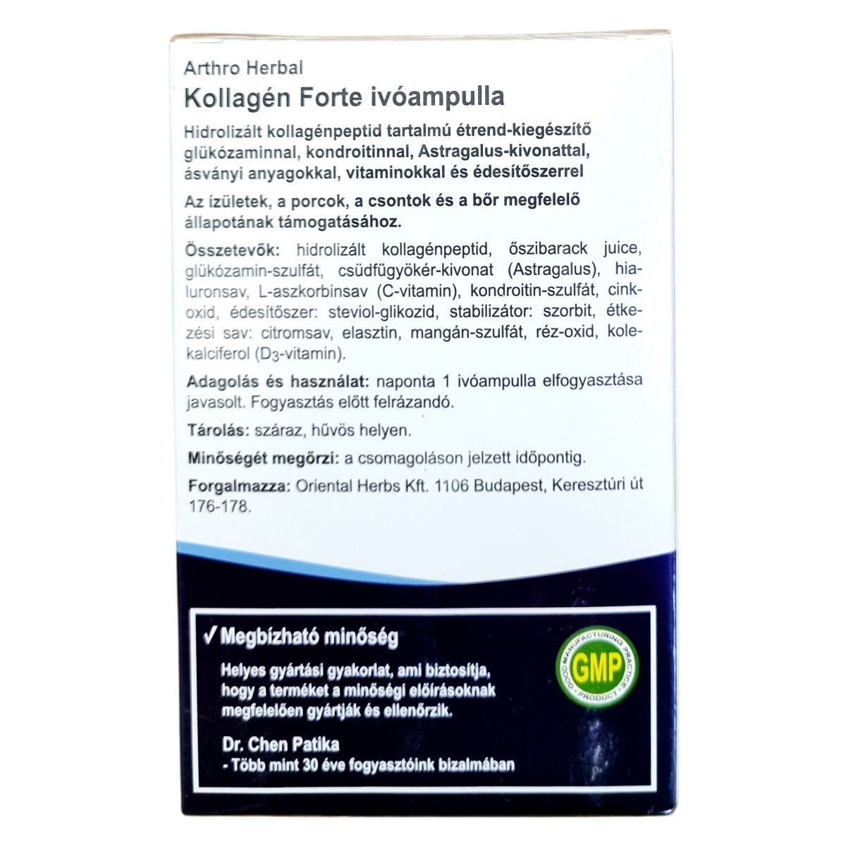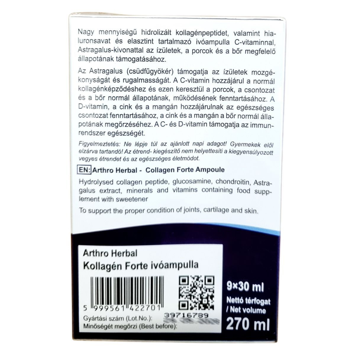 A termék hidrolizált kollagénpeptidet, glükózamint, kondroitint és Astragalus-kivonatot tartalmazhat, amelyek hozzájárulhatnak az ízületek, a porcok és a bőr megfelelő állapotának fenntartásához.
