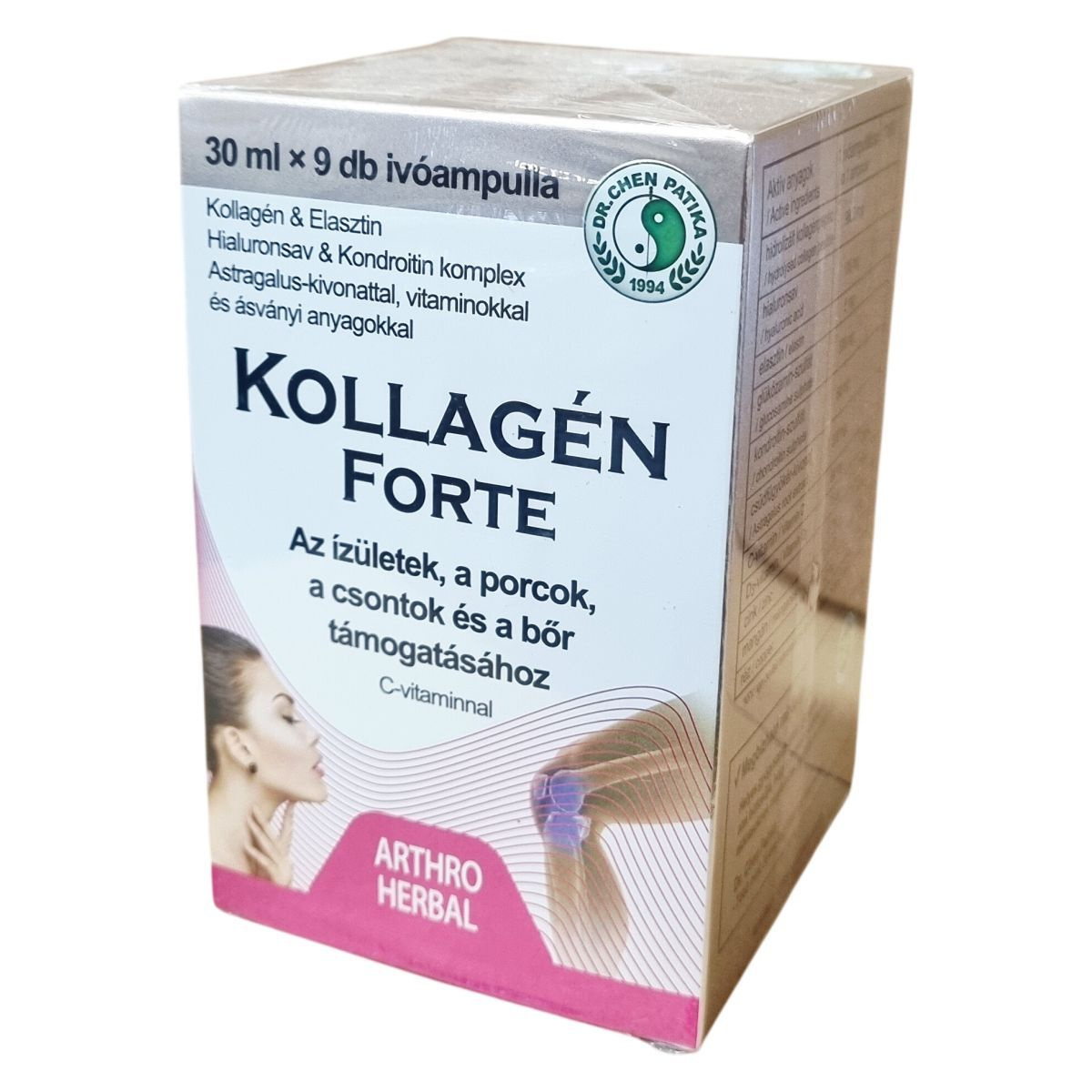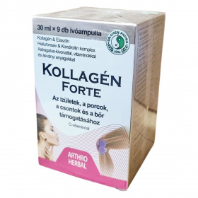 Az Arthro Herbal Kollagén Forte ivóampulla olyan étrend-kiegészítő, amely hidrolizált kollagénpeptideket, glükózamint, kondroitint, Astragalus-kivonatot, valamint vitaminokat és ásványi anyagokat tartalmaz. Kiemelt mennyiségű hialuronsavat és elasztint is tartalmaz, melyek hozzájárulhatnak az ízületek, porcok és bőr megfelelő állapotának támogatásához. Az Astragalus (csüdfügyökér) segítheti az ízületek mozgékonyságát és rugalmasságát. A C-vitamin hozzájárulhat a normál kollagénképződéshez, ezzel támogatva a porcok, csontozat és bőr normál működését. A D-vitamin, cink és mangán hozzájárulhatnak a csontozat egészségének megőrzéséhez, míg a cink és mangán a bőr normál állapotának fenntartásában játszhat szerepet. A C- és D-vitamin az immunrendszer működését is támogathatja. Az ivóampullák édesítőszerrel készülnek, és a használat előtt fel kell rázni őket. A termék a minőségi előírások szerint, helyes gyógyszergyártási gyakorlat betartásával készül, hosszú évek óta megbízható a fogyasztók körében.